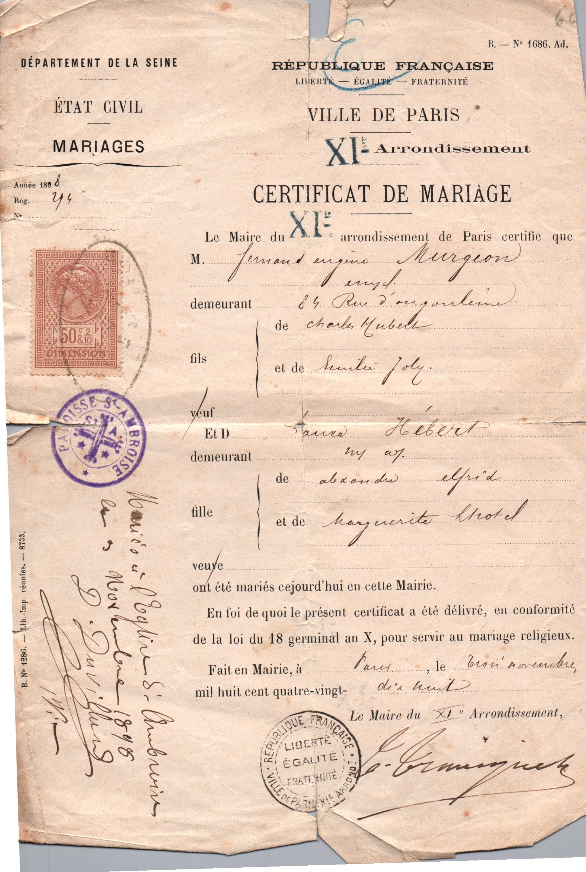 • 1998 : Murgeon Fernand Eugène : Certificat de mariage