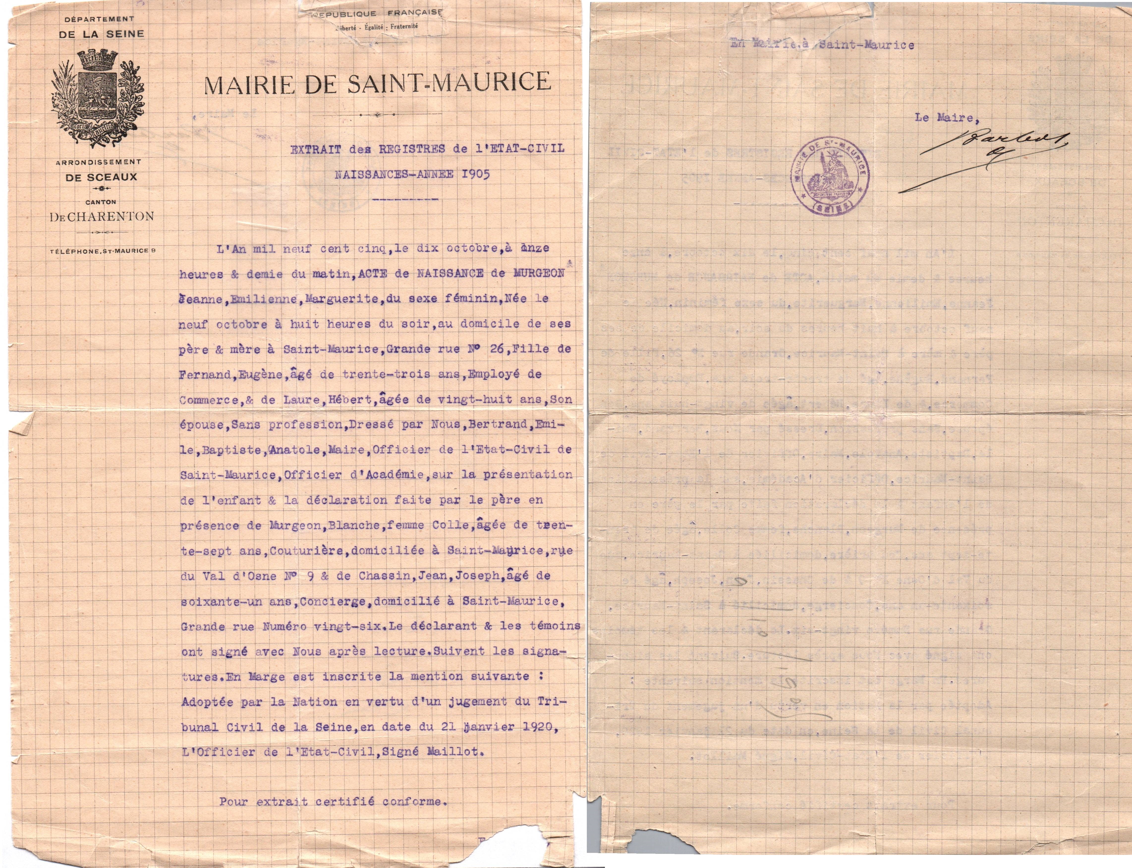 • 1905 : Murgeon Jeanne : Acte de naissance