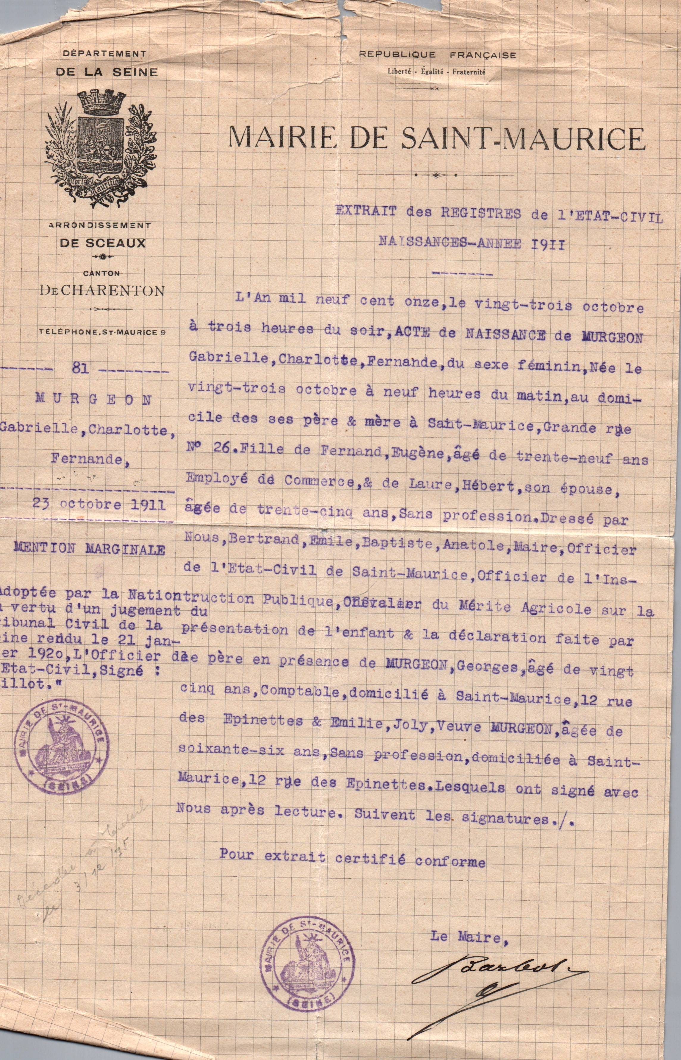• 1911 : Murgeon Gabrielle : Acte de naissance