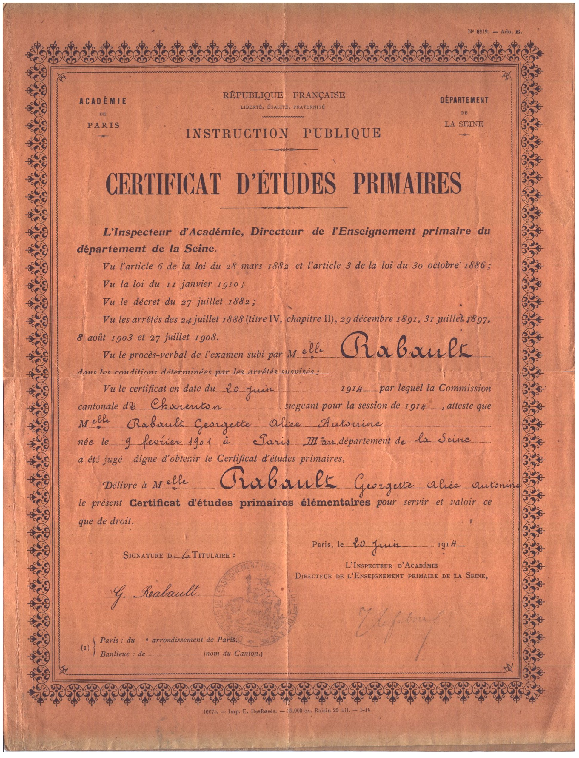 • 1914 : Rabault Georgette : Certificat d'études primaires