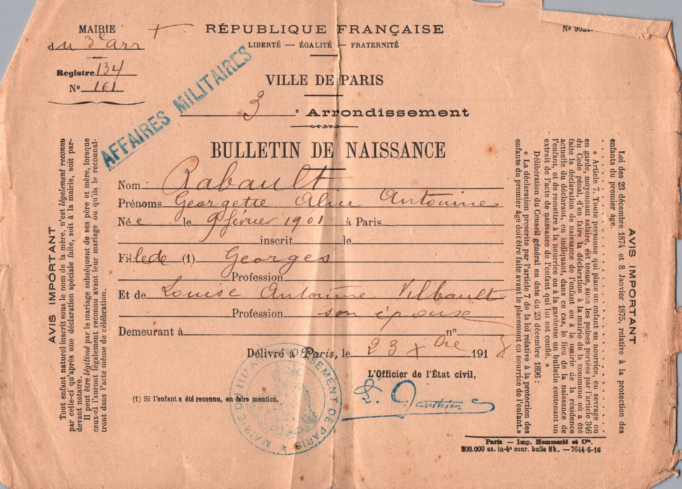 • 1918 : Rabault Georgette : Bulletin de naissance