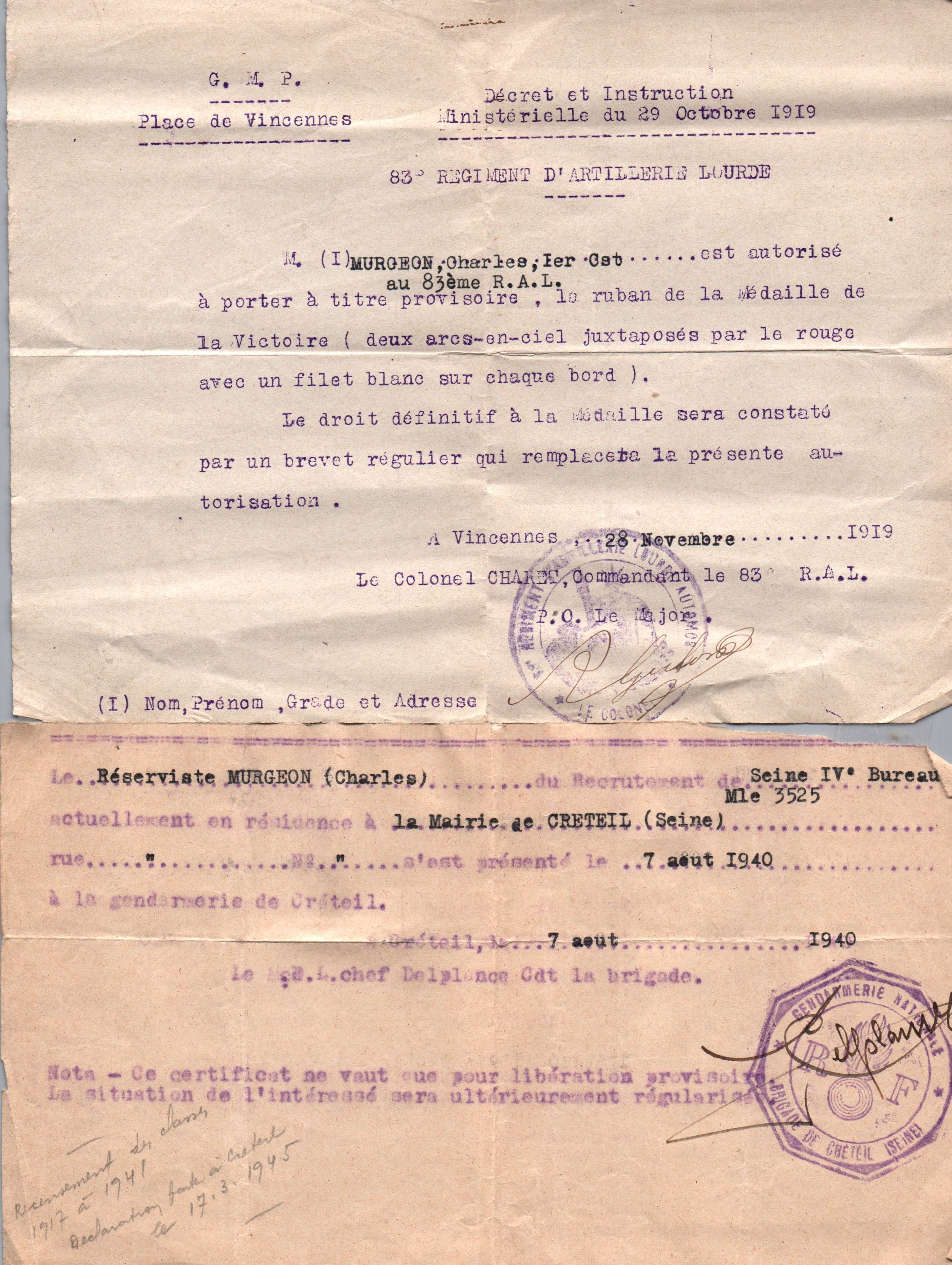 • 1919 : Murgeon Charles (1899-1976) : Médaille de la victoire