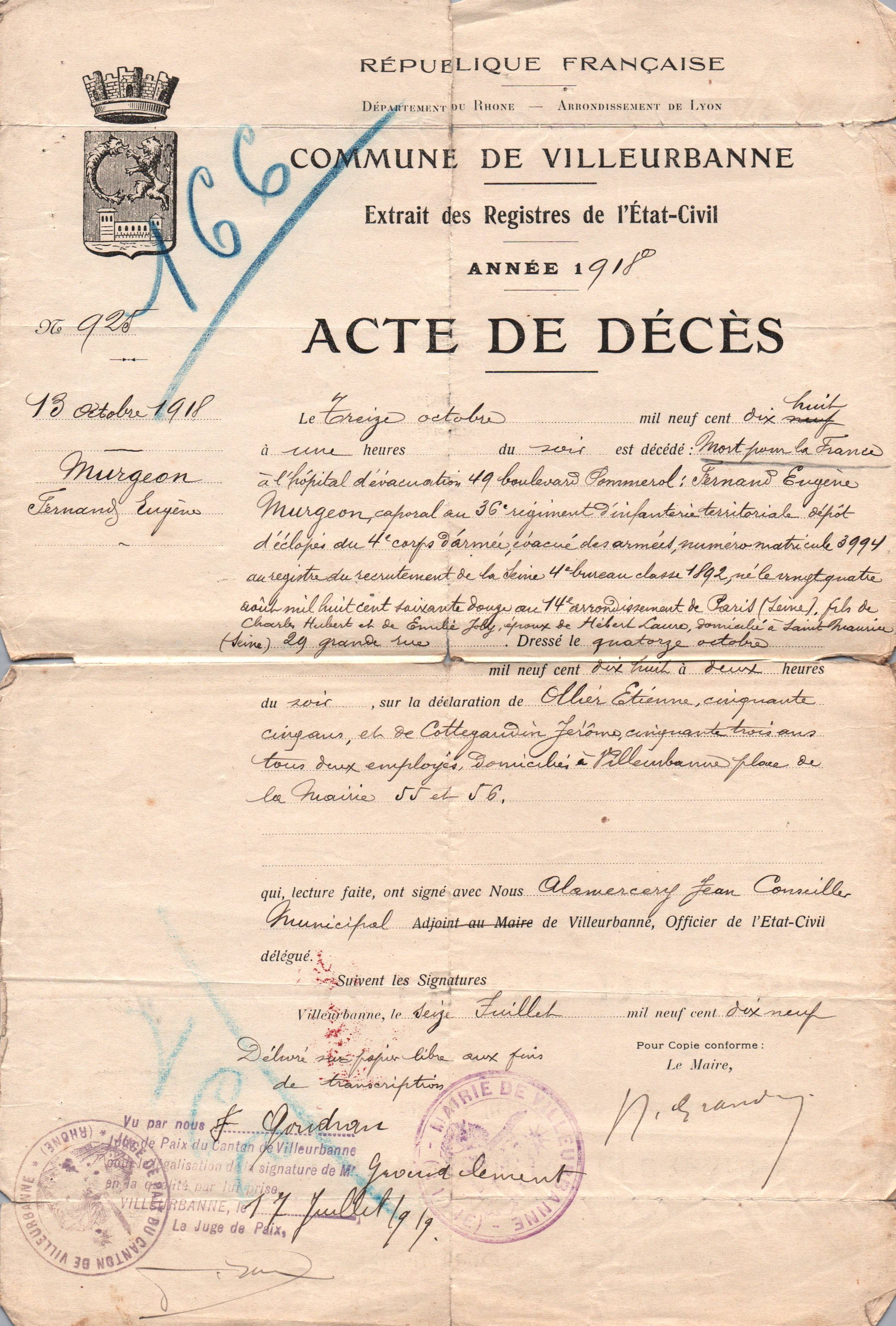 • 1919 : Murgeon Fernand Eugène : Acte de décès
