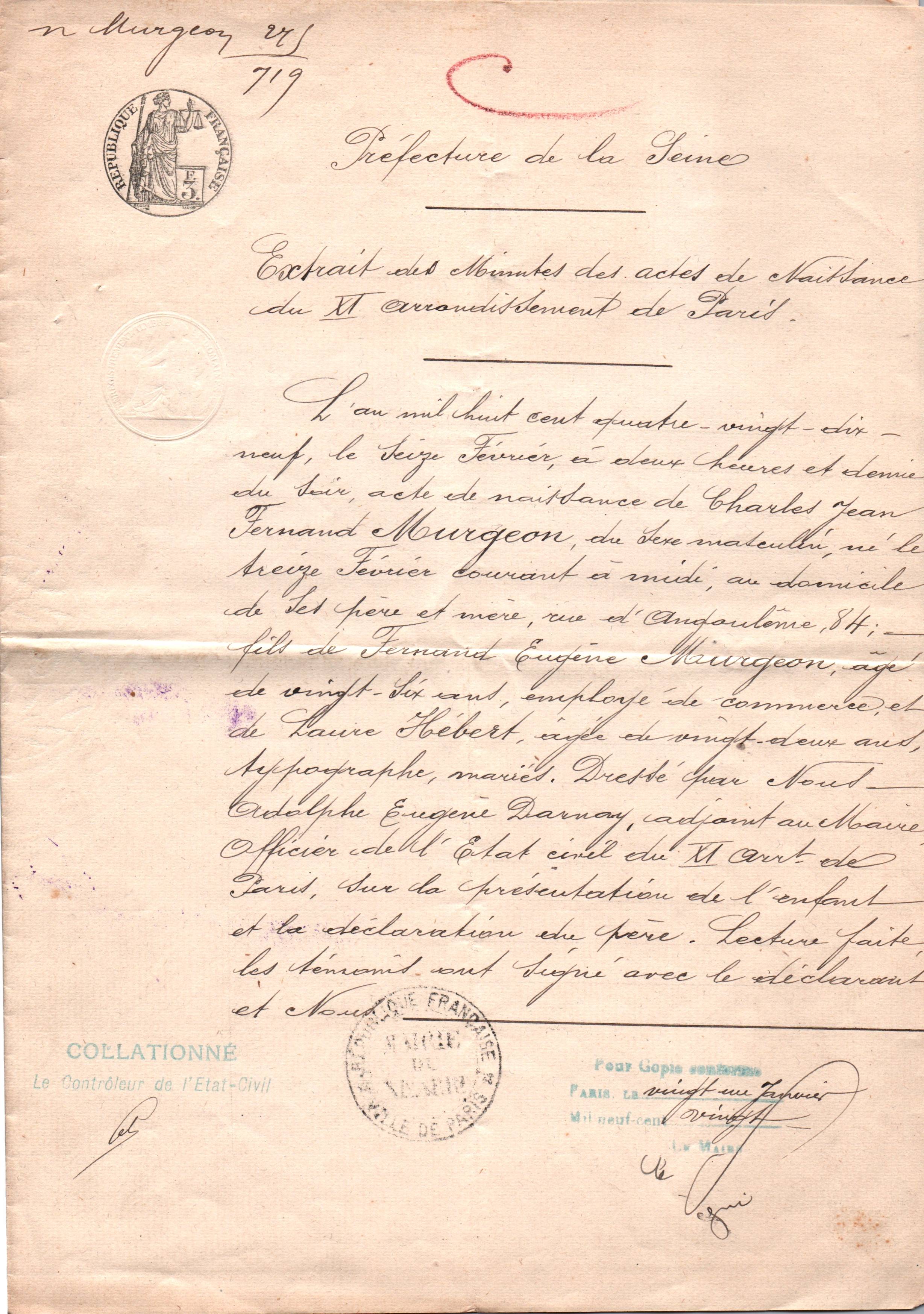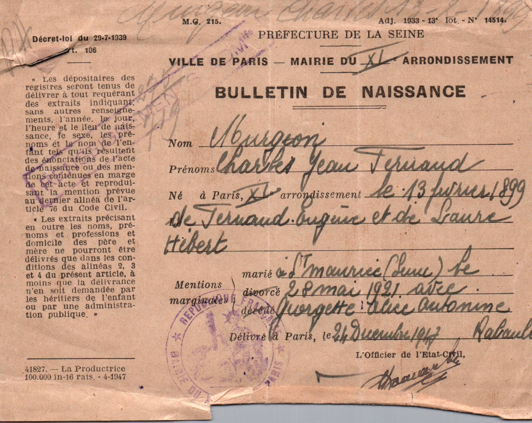 • 1947 : Murgeon Charles (1899-1976) : Bulletin de naissance