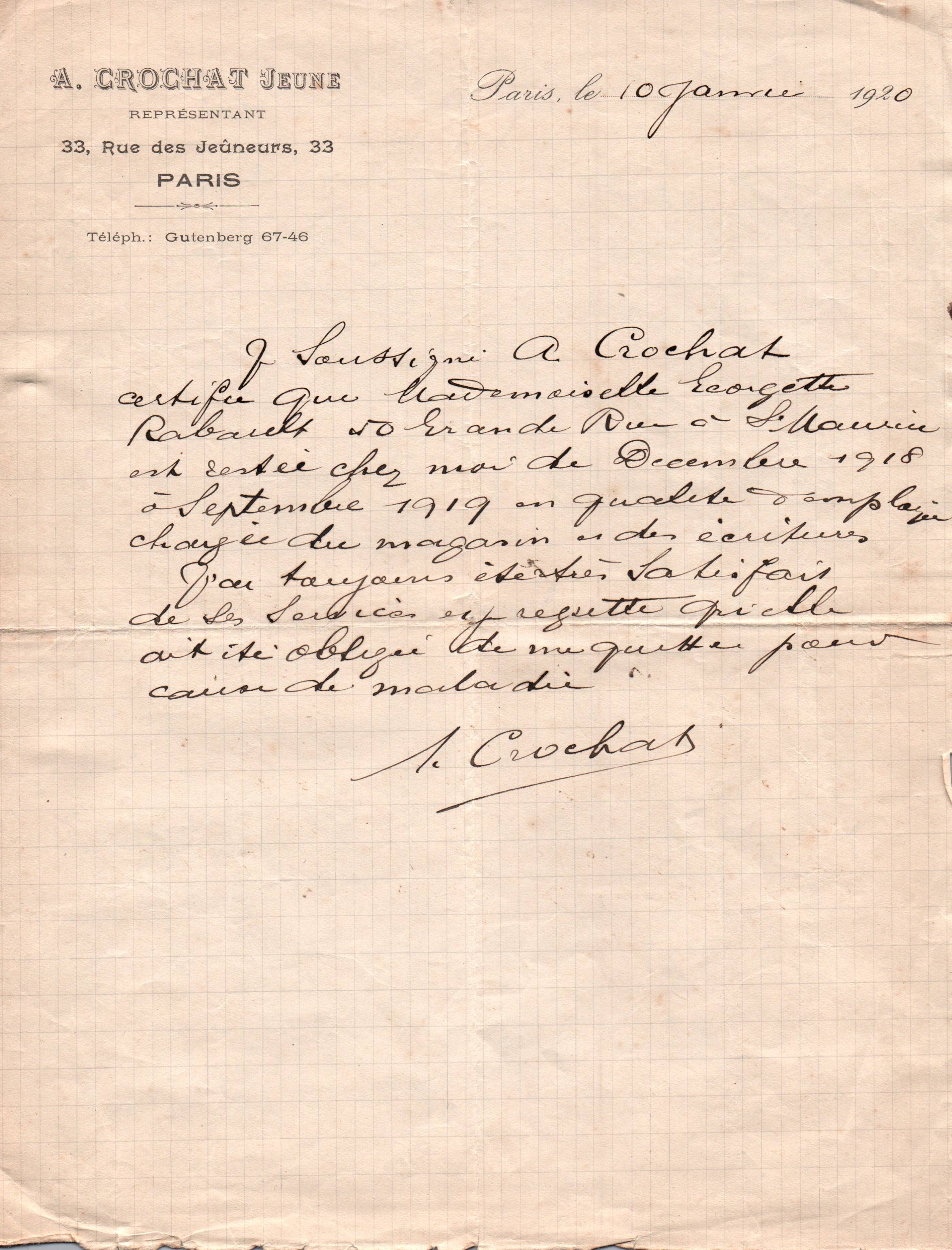 • 1920 : Rabault Georgette : Certificat de travail