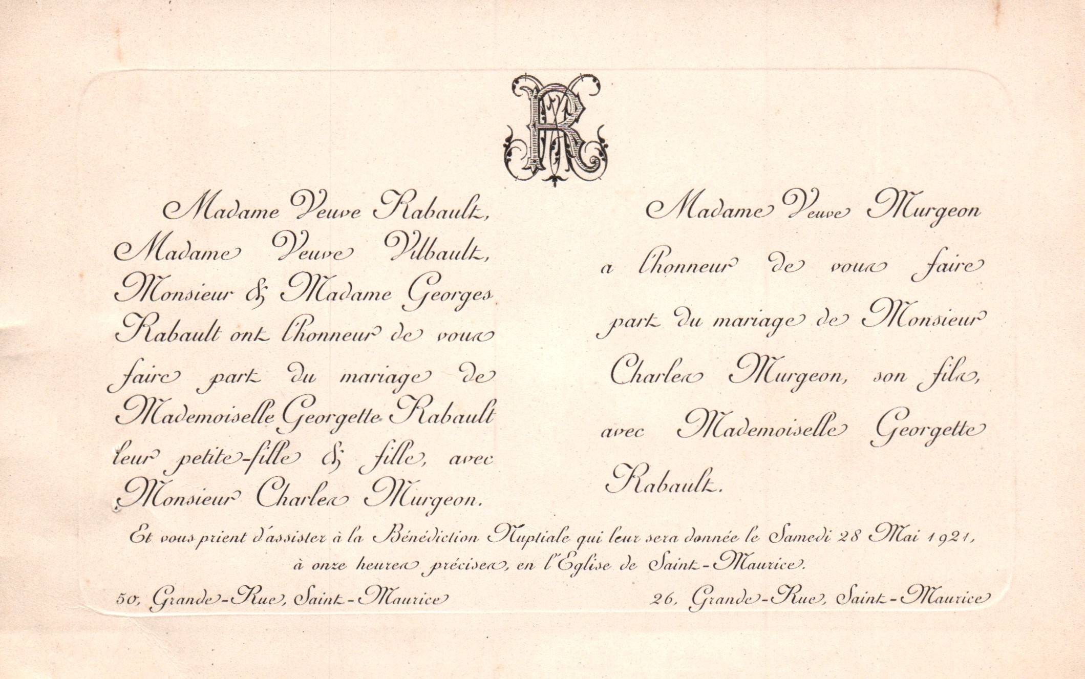 • 1921 : Murgeon Charles (1899-1976) et Georgette : Faire part de mariage