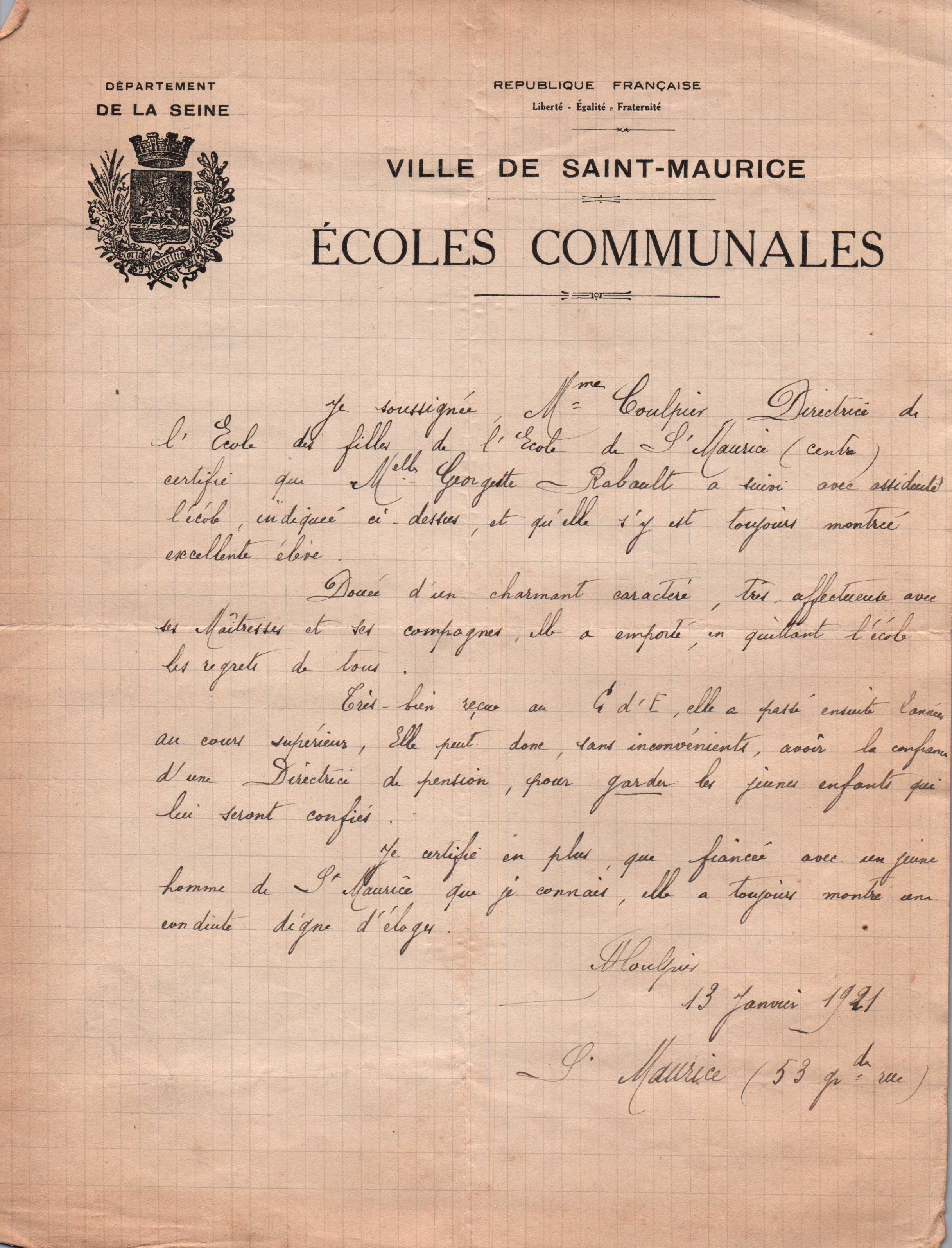 • 1921 : Rabault Georgette : Certificat de scolarité
