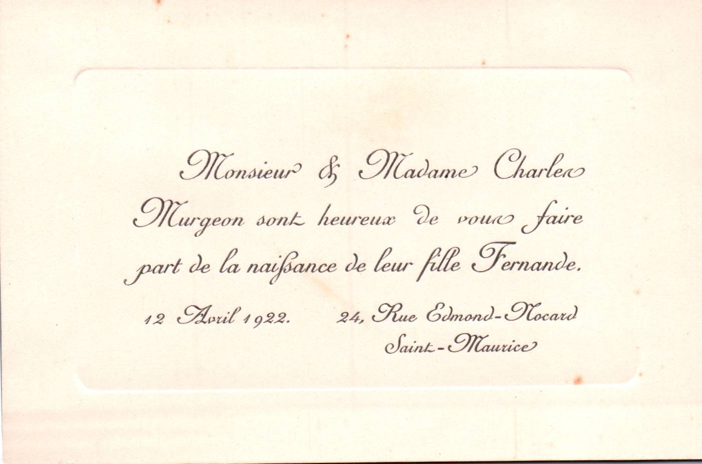 • 1922 : Murgeon Fernande : Faire part de naissance