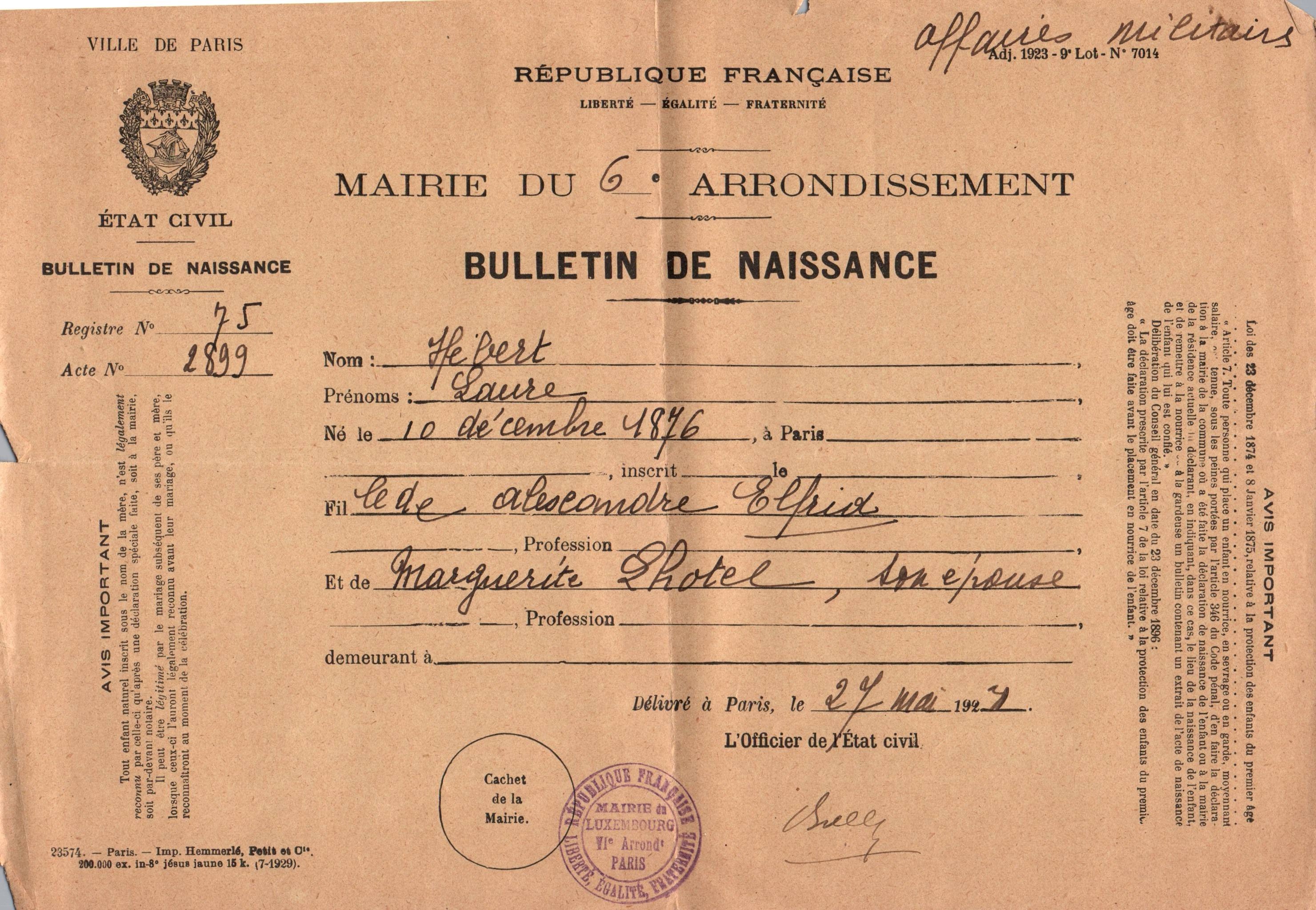 • 1923 : Hebert Laure : Bulletin de naissance
