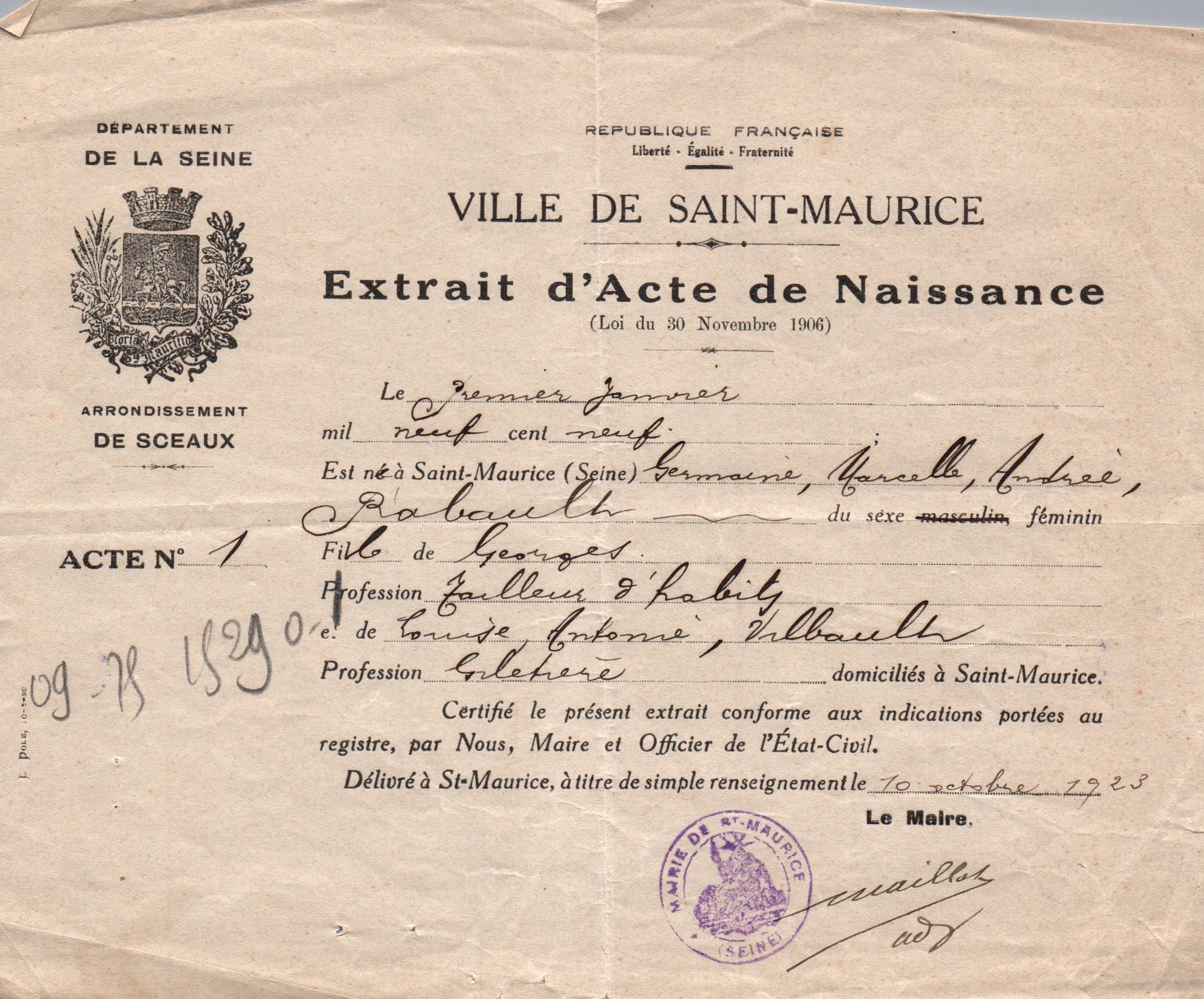 • 1923 : Rabault Germaine : Extrait d'acte de naissance