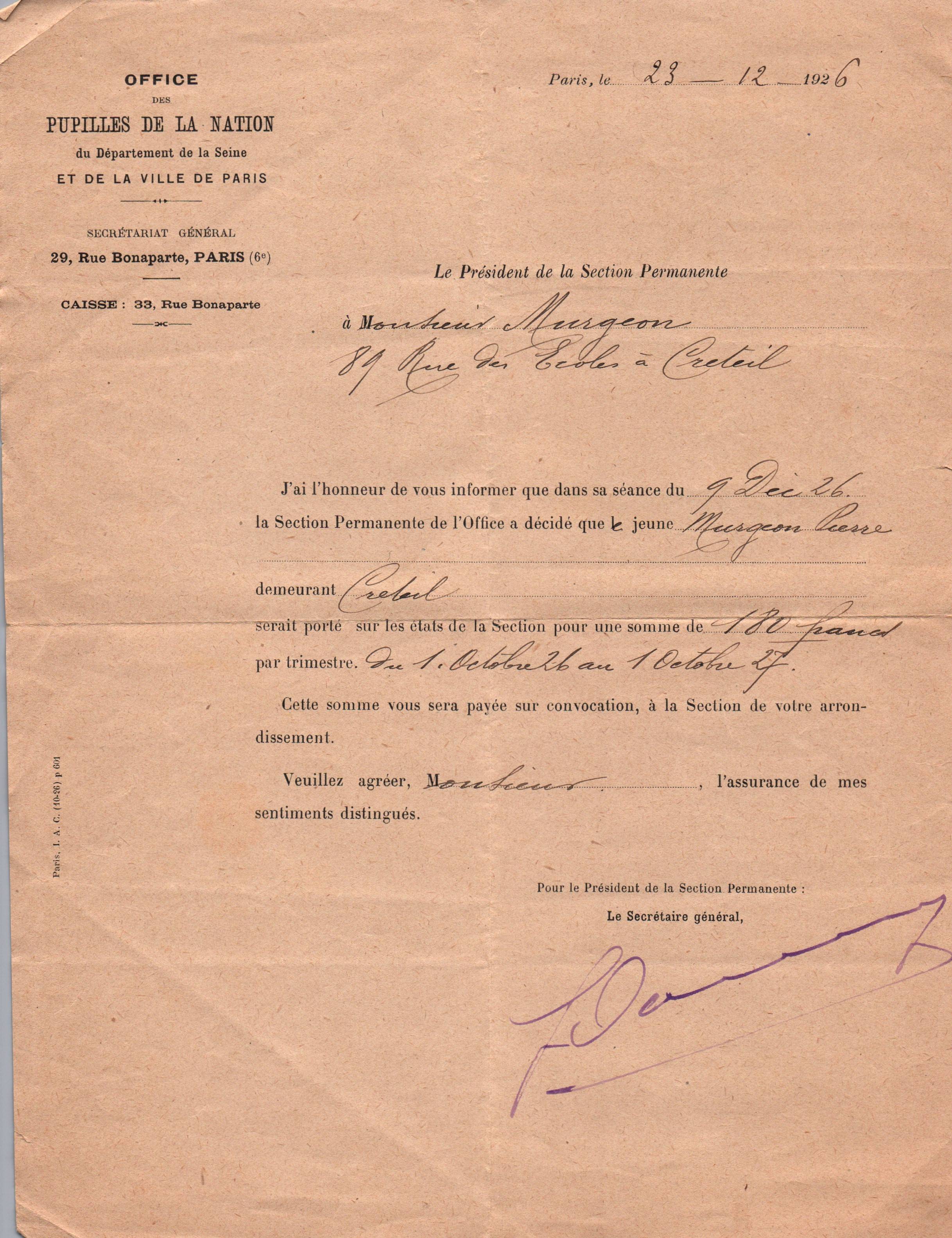• 1926 : Murgeon Pierre : Pupille de la nation