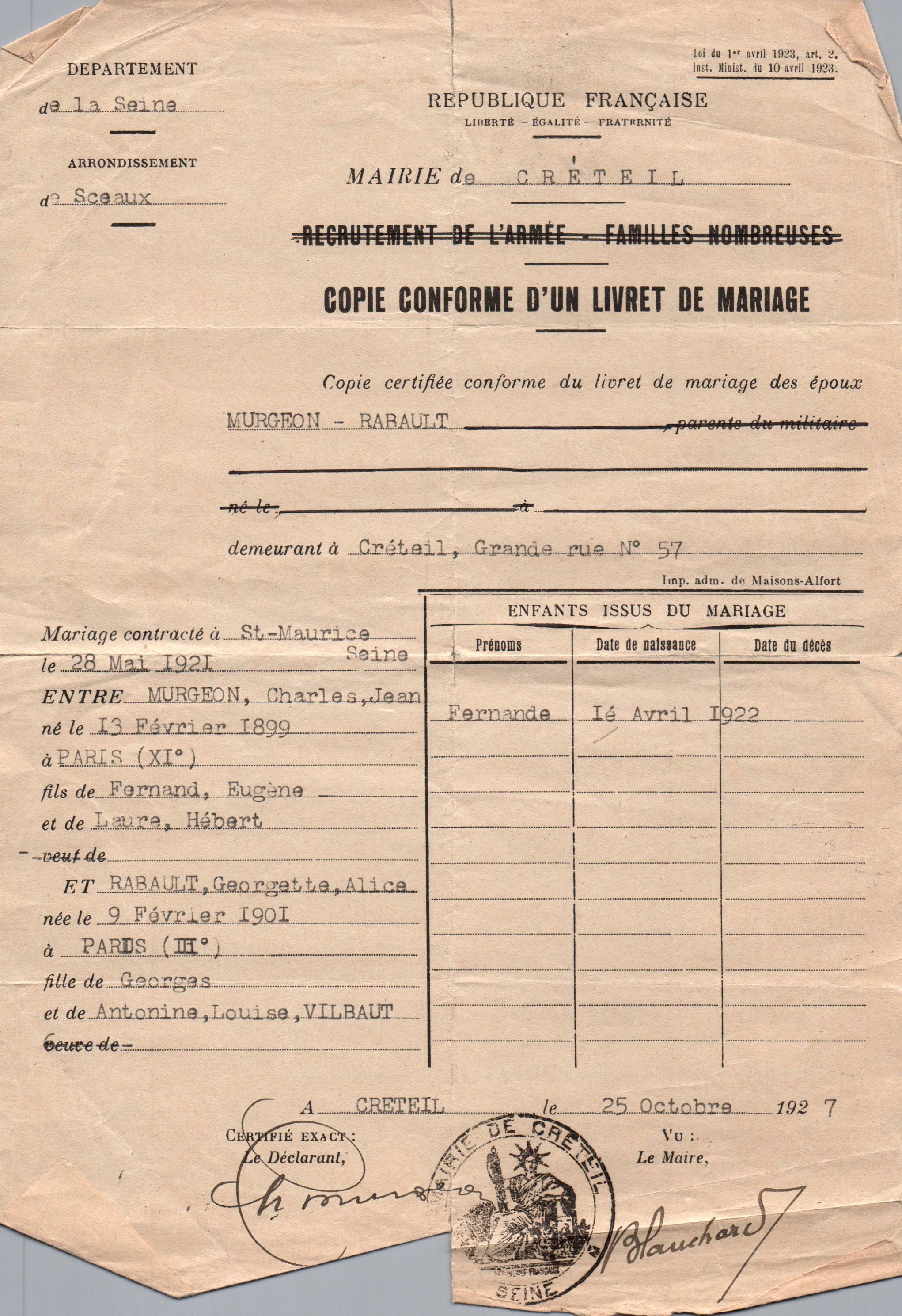 • 1927 : Murgeon Charles (1899-1976): Copie livret de mariage
