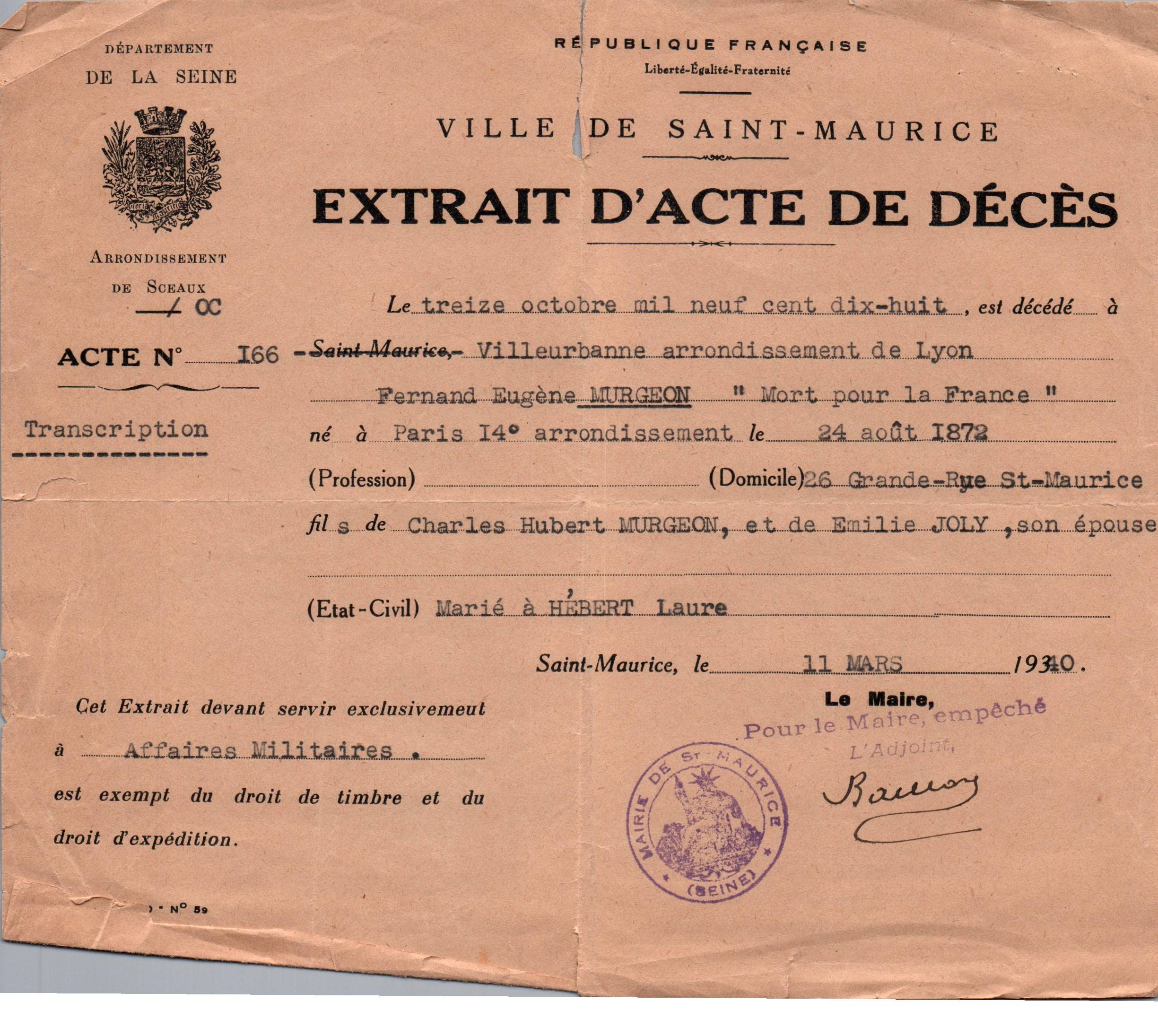 • 1930 : Murgeon Fernand Eugène : Extrait d'acte de décès