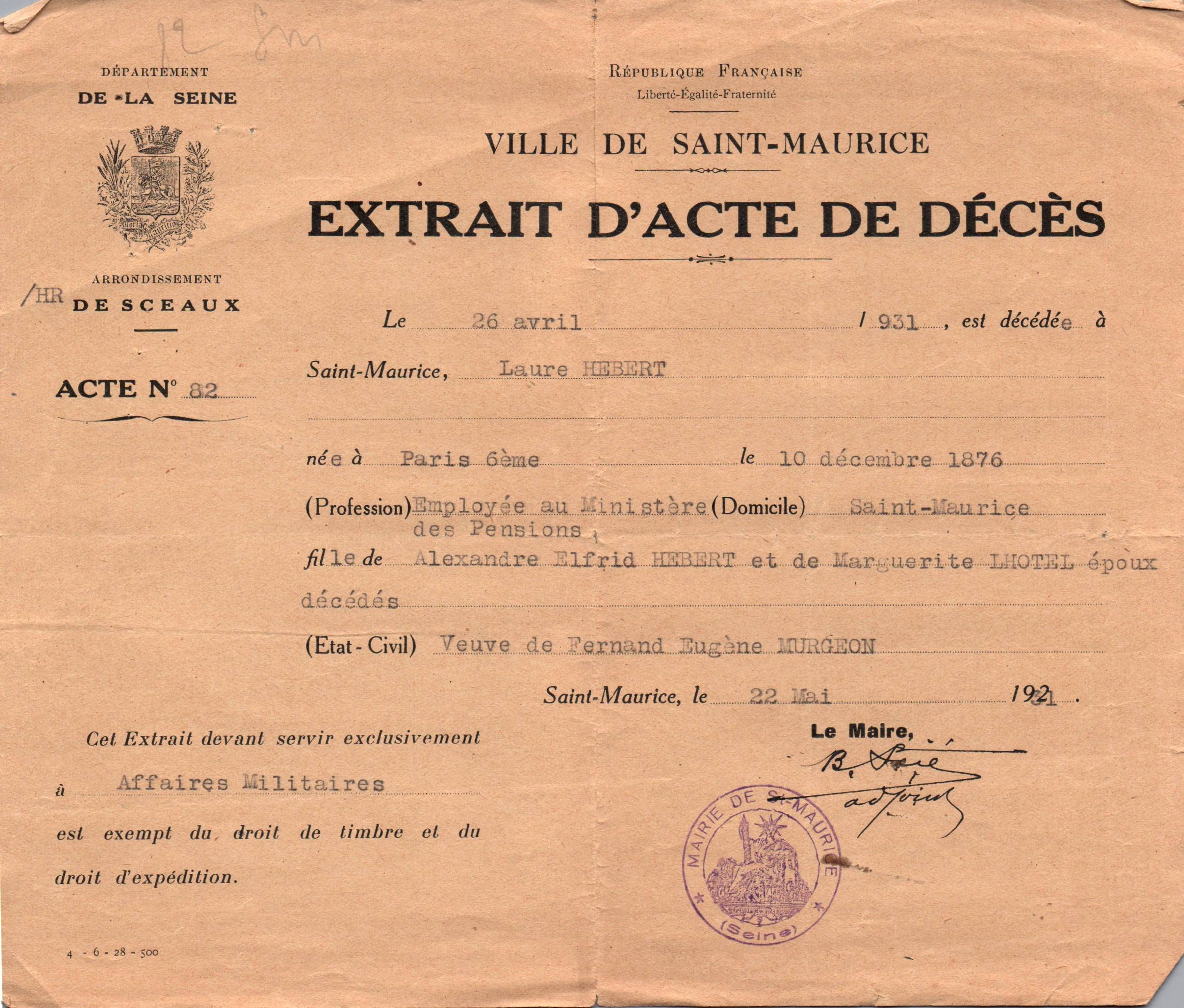 • 1931 : Hébert Laure : Extrait acte de décès