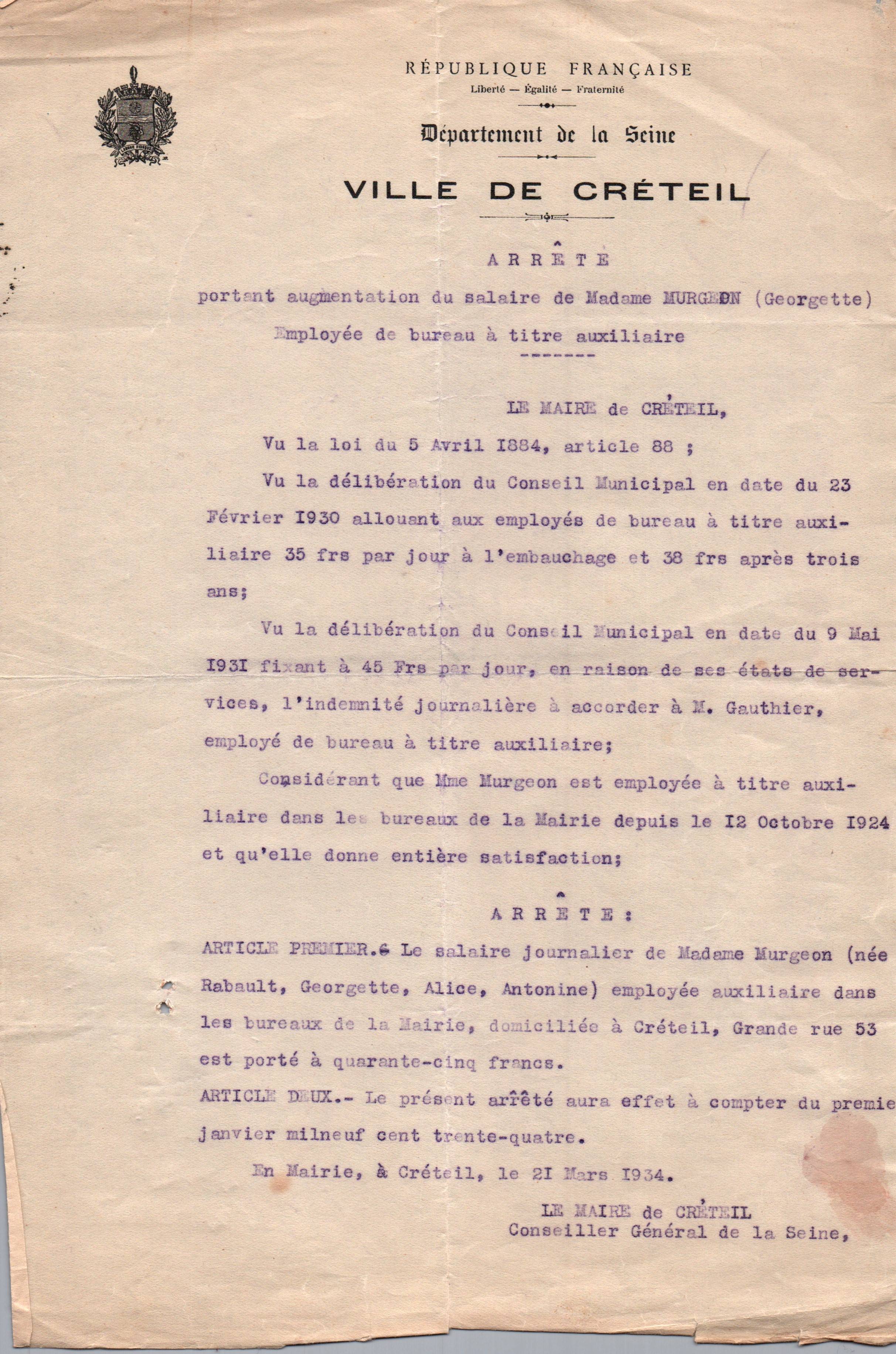 • 1934 : Murgeon Georgette : Augmentation de salaire
