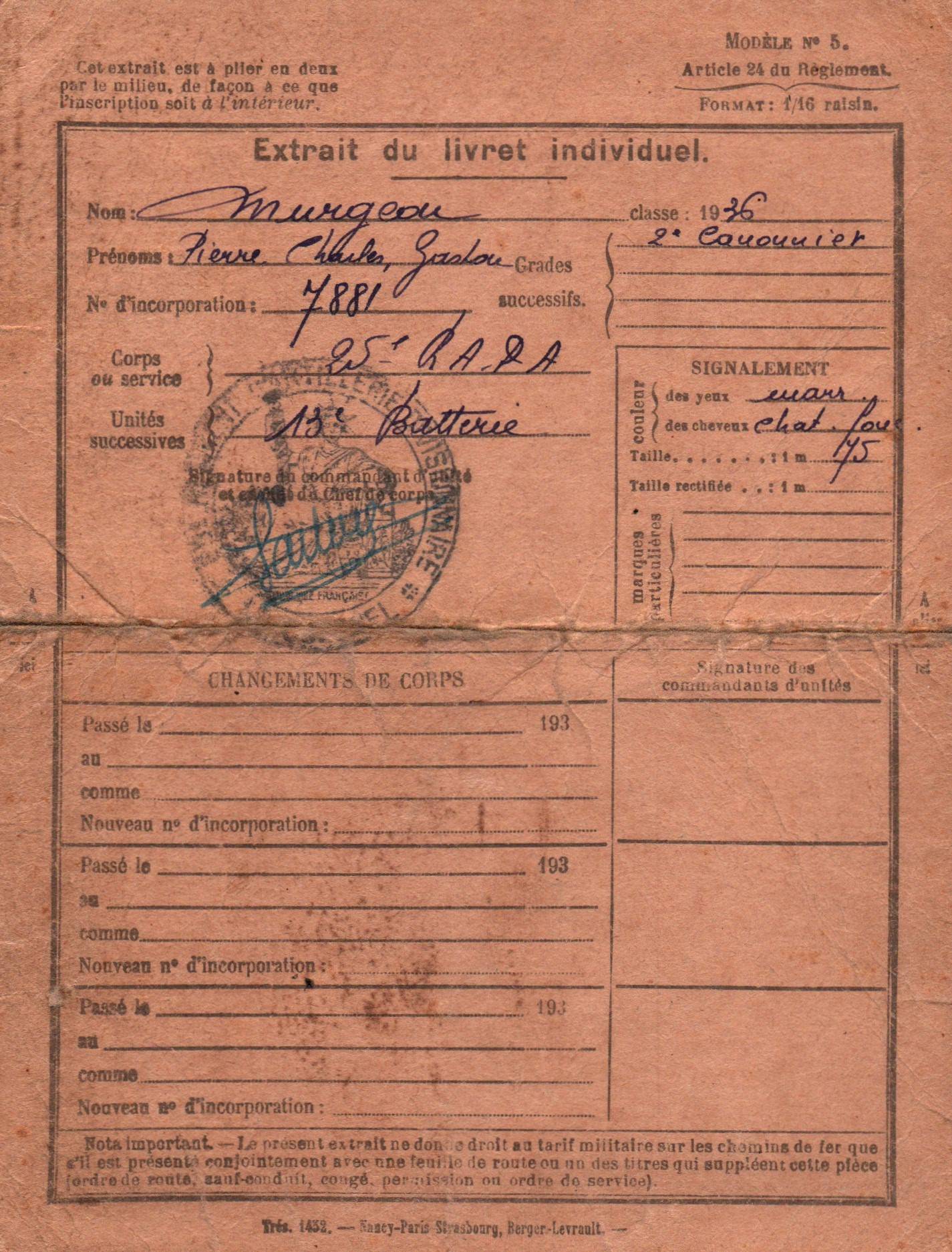 • 1936 : Murgeon Pierre : Extrait du livret individuel