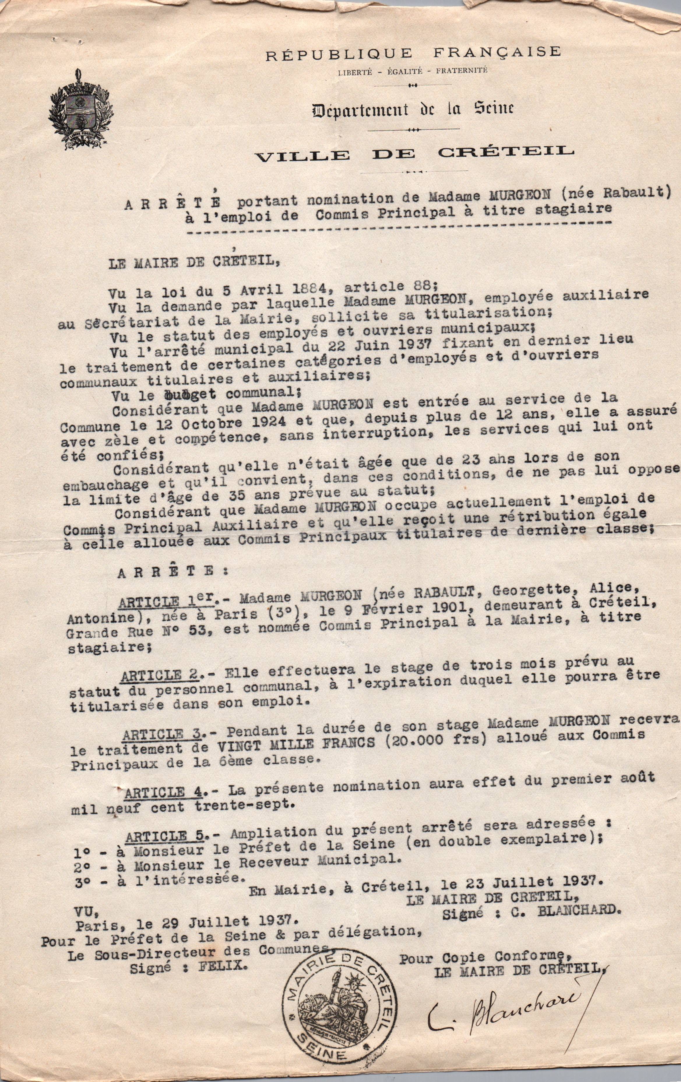 • 1937 : Murgeon Georgette : Commis principal