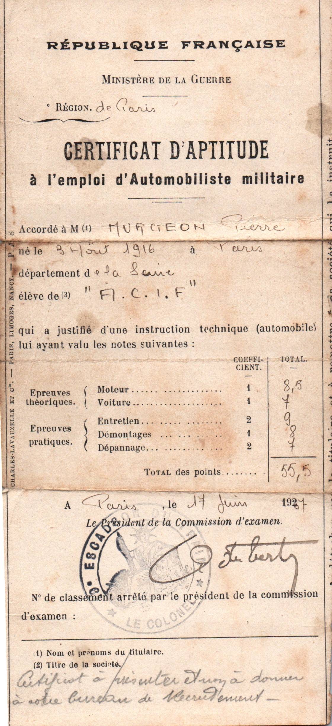 • 1937 : Murgeon Pierre : Certificat d'aptitude à l'emploi d'automobiliste militaire