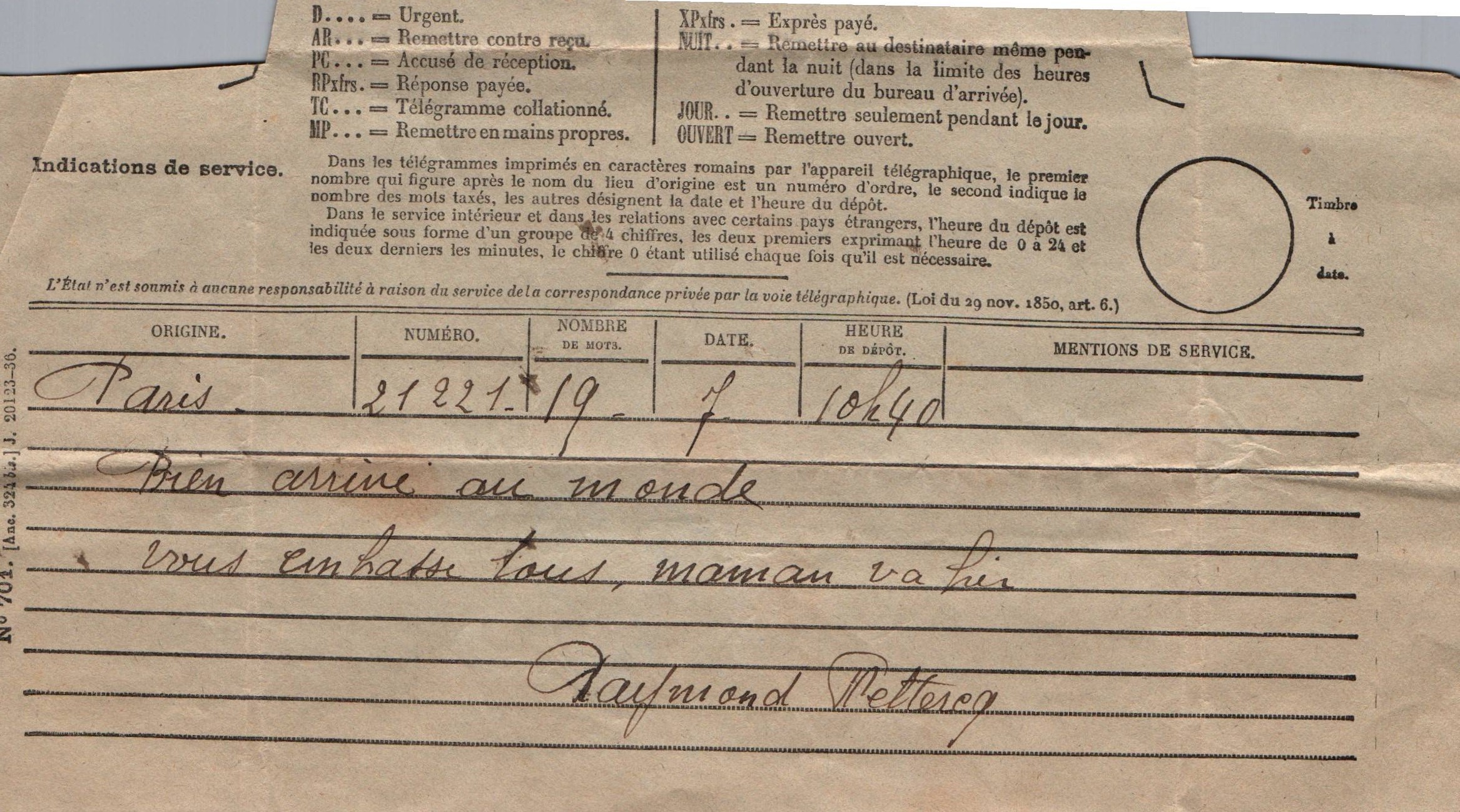 • 1937 : Vetter Raymond : télégramme