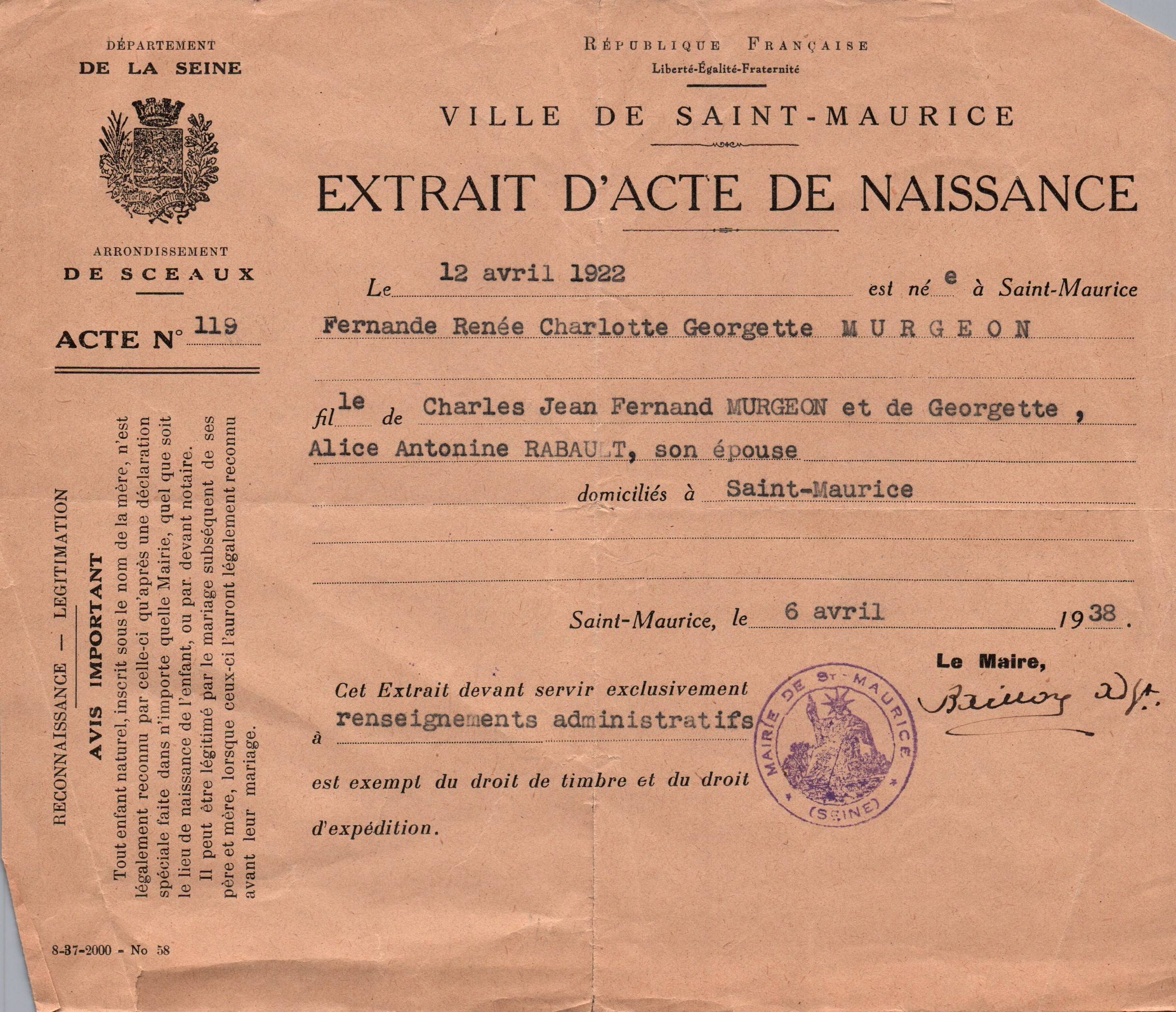 • 1938 : Murgeon Fernande : Extrait d'acte de naissance