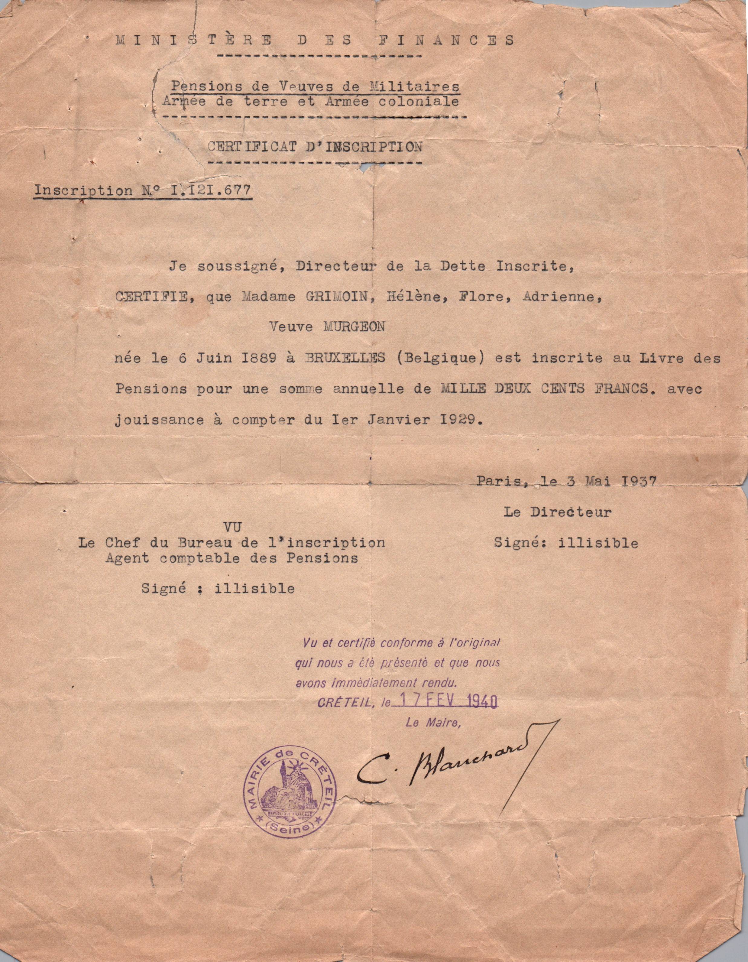 • 1940 : Murgeon Hélène : Copie du document de pension de veuve militaire