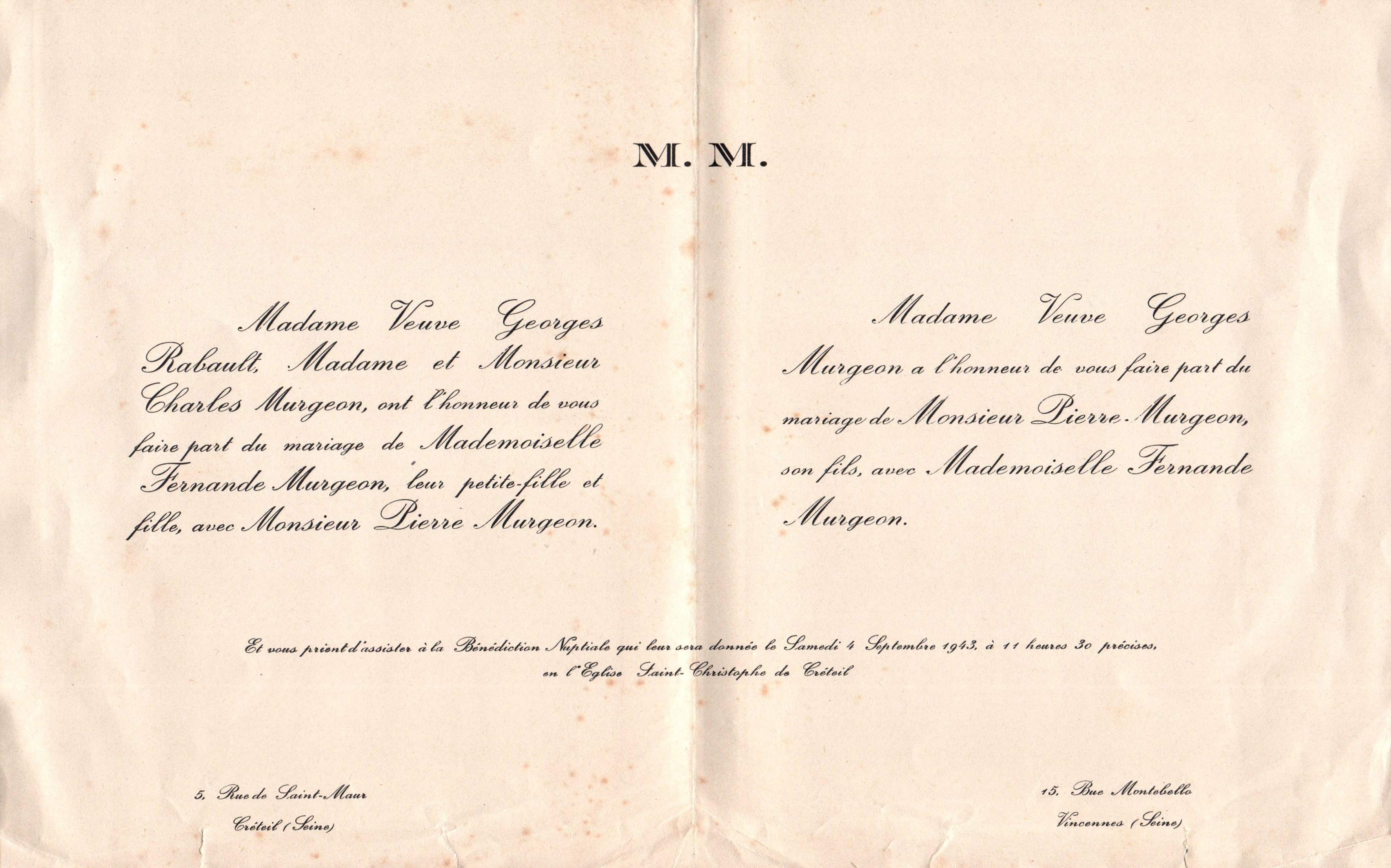 • 1943 : Murgeon Pierre et Fernande : Faire part de mariage