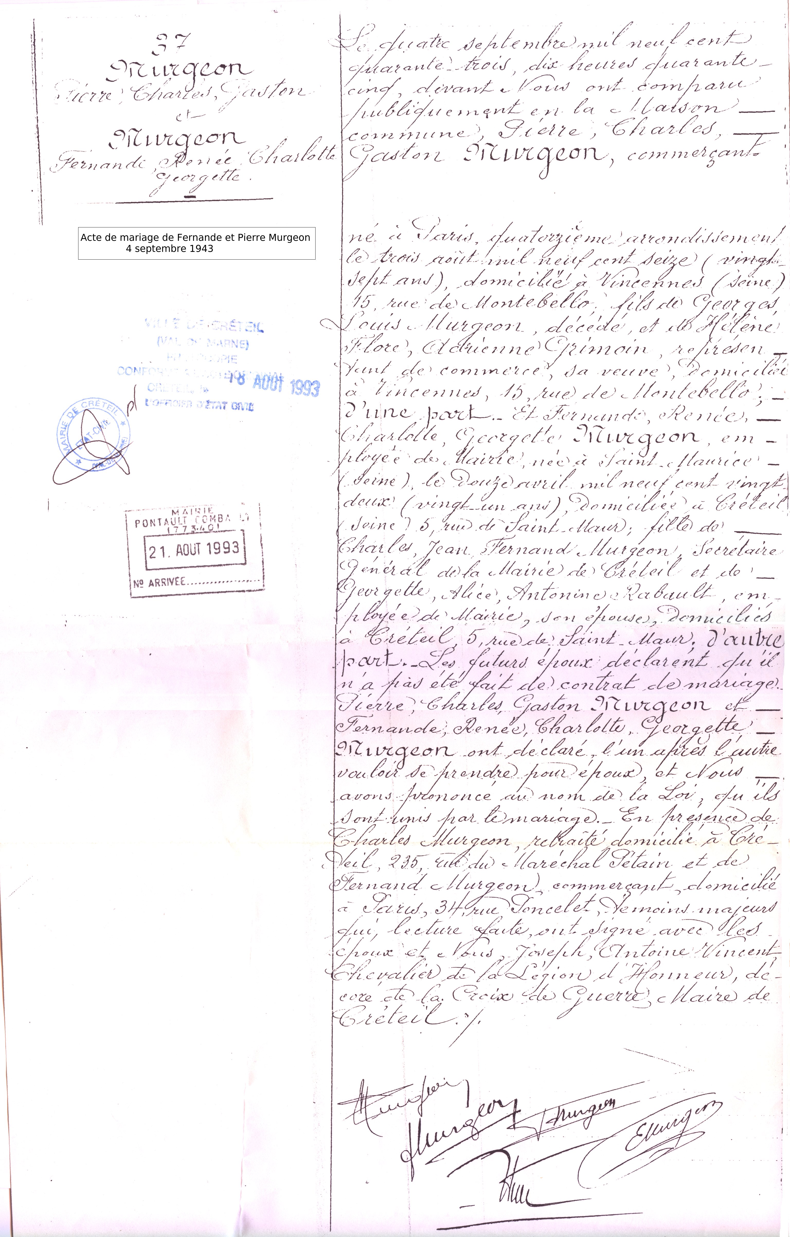 • 1943 : Murgeon Pierre : Acte de mariage