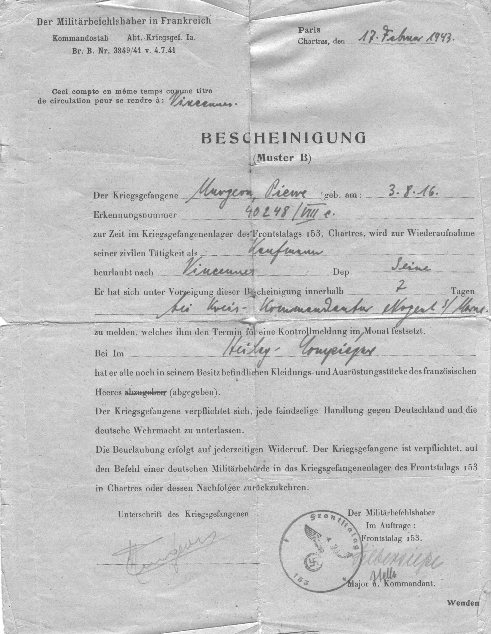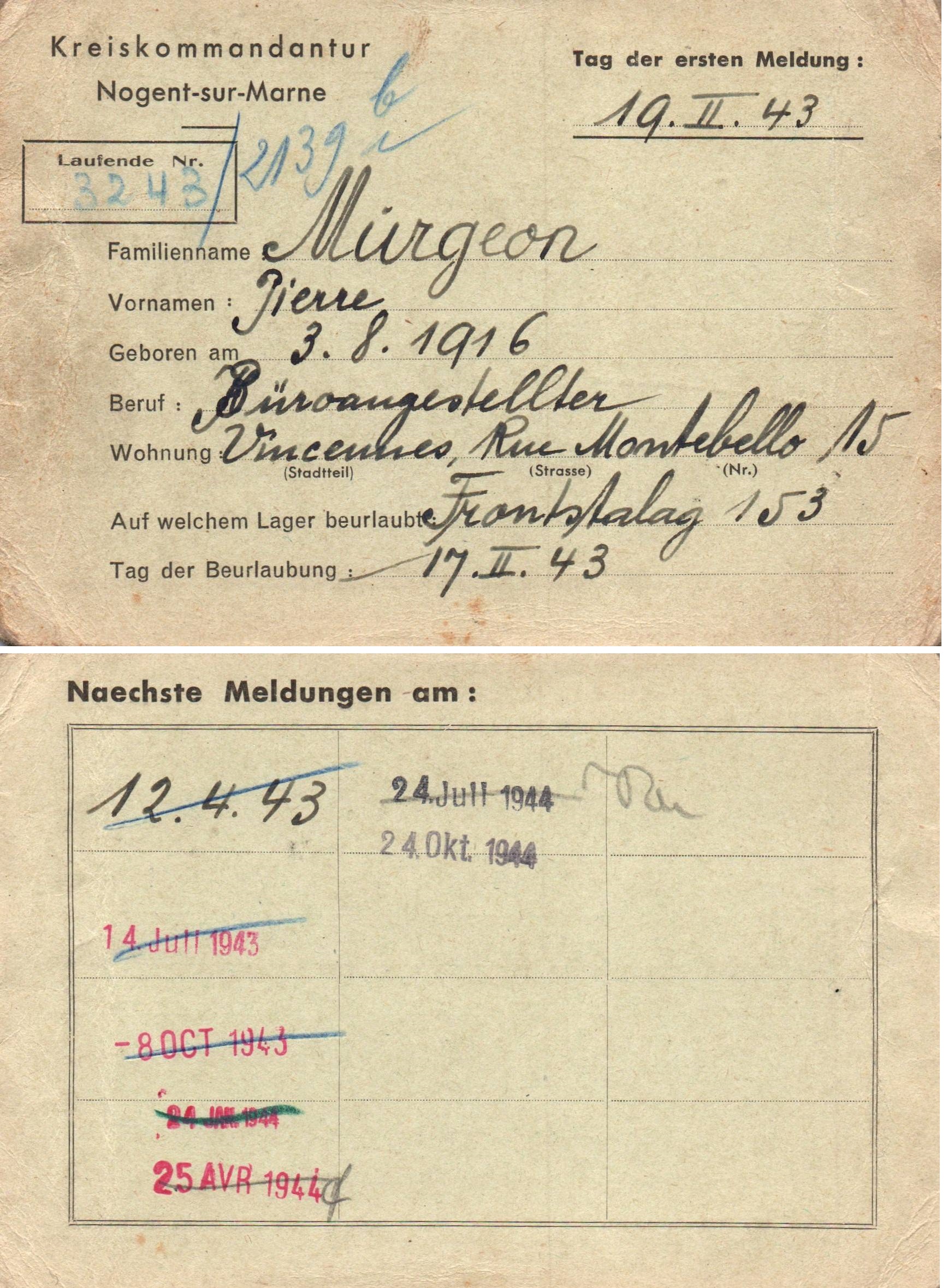 • 1943 : Murgeon Pierre : Titre de circulation de prisonnier de guerre