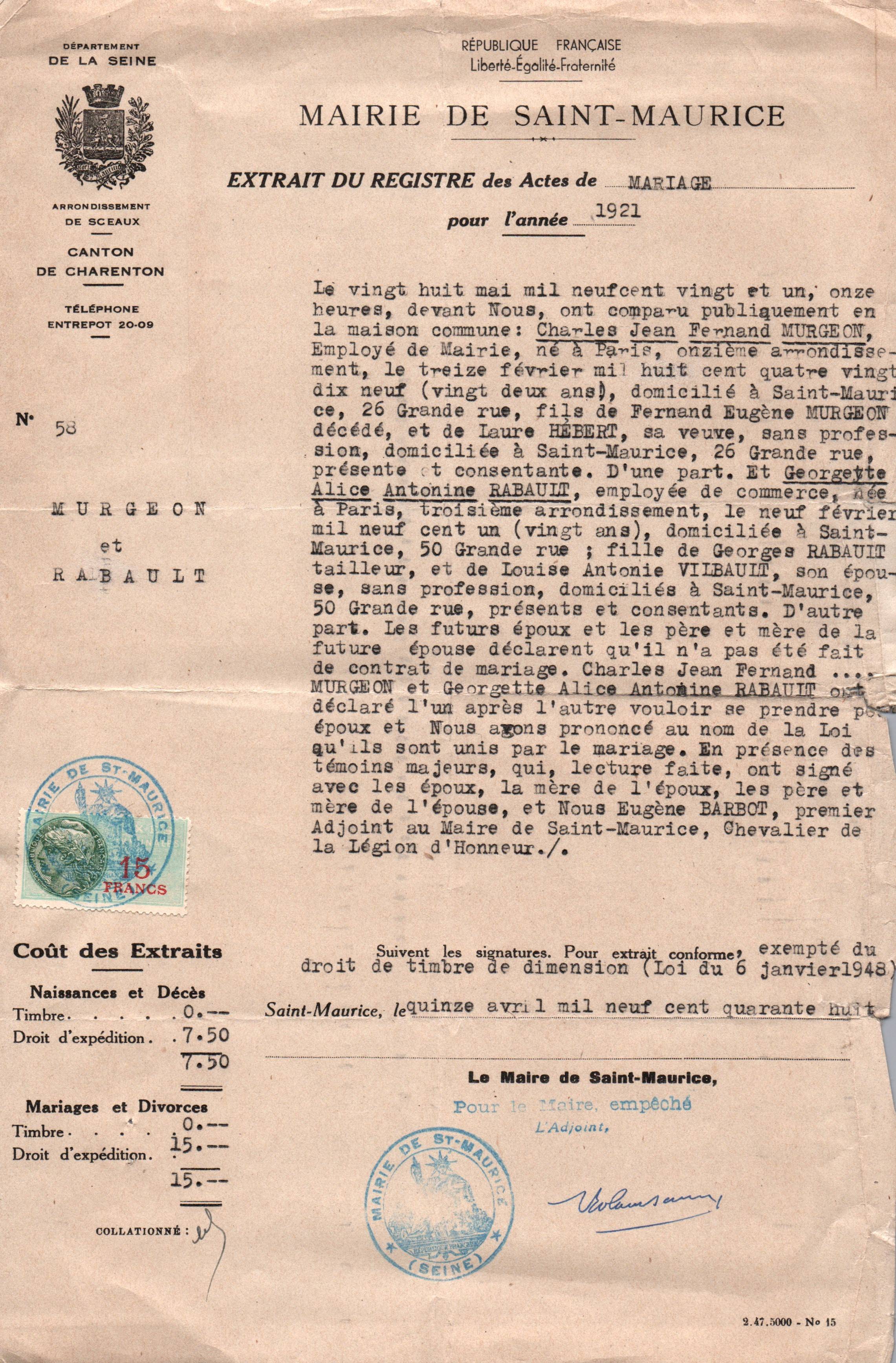 • 1948 : Murgeon Charles et Georgette: Extrait du registre des actes de mariages