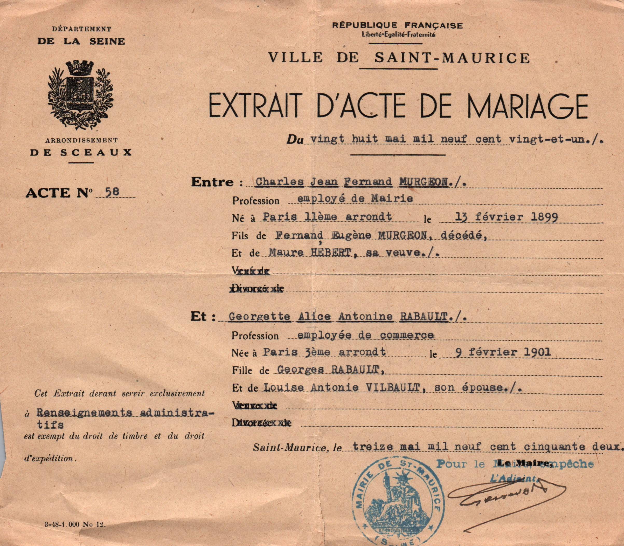 • 1952 : Murgeon Charles et Georgette : Extrait d'acte de mariage