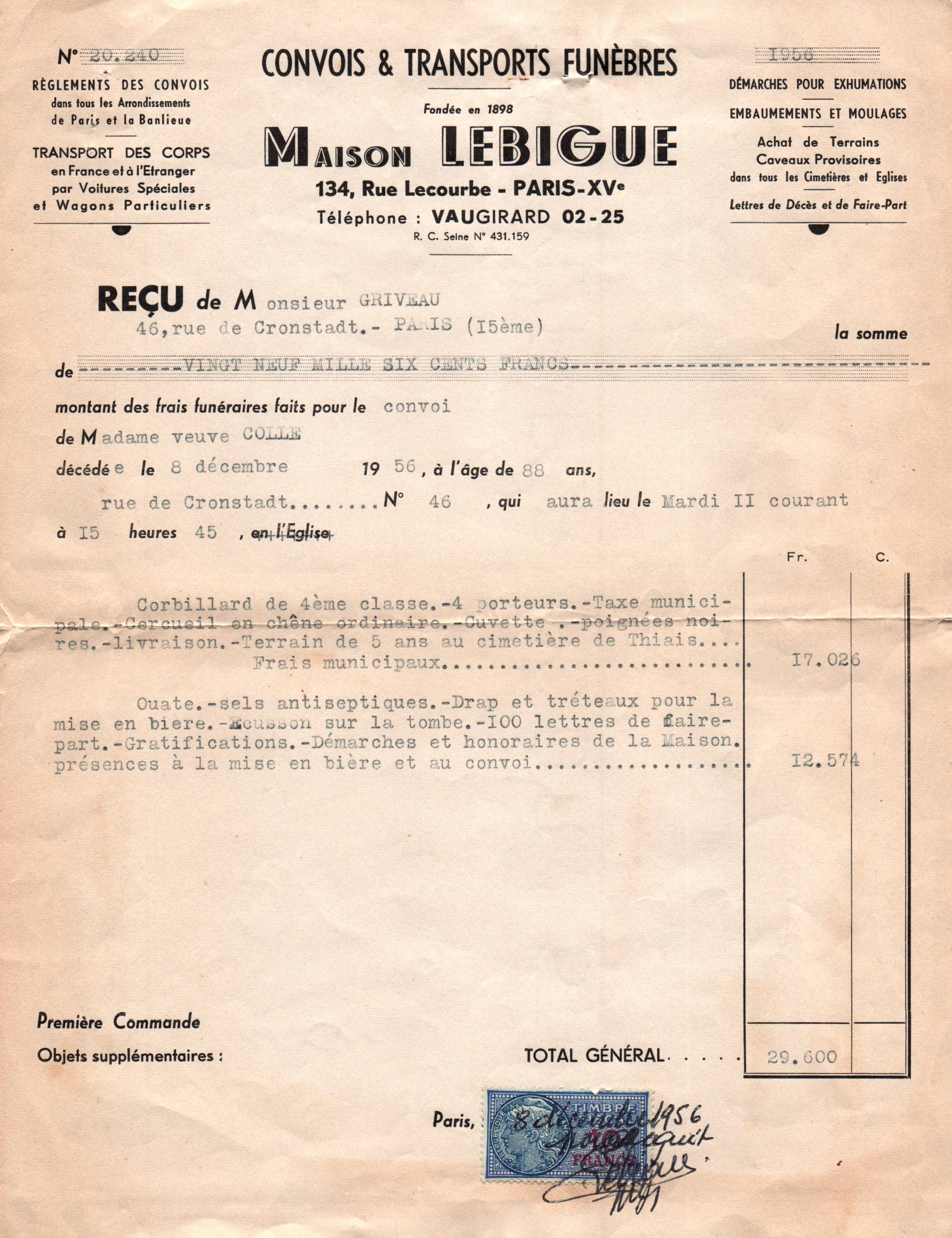 • 1966 : Griveau Marcelle née Colle: Concession cimetière de Thiais