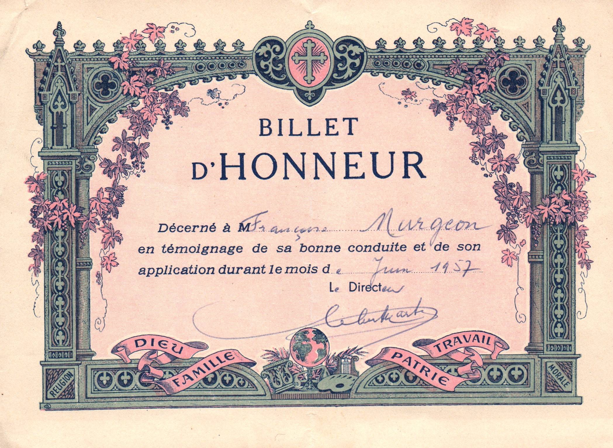 • 1957 : Murgeon Fraçoise: Billet d'honneur Ecole Sainte Marie à Créteil (institutrice Melle Riddray)