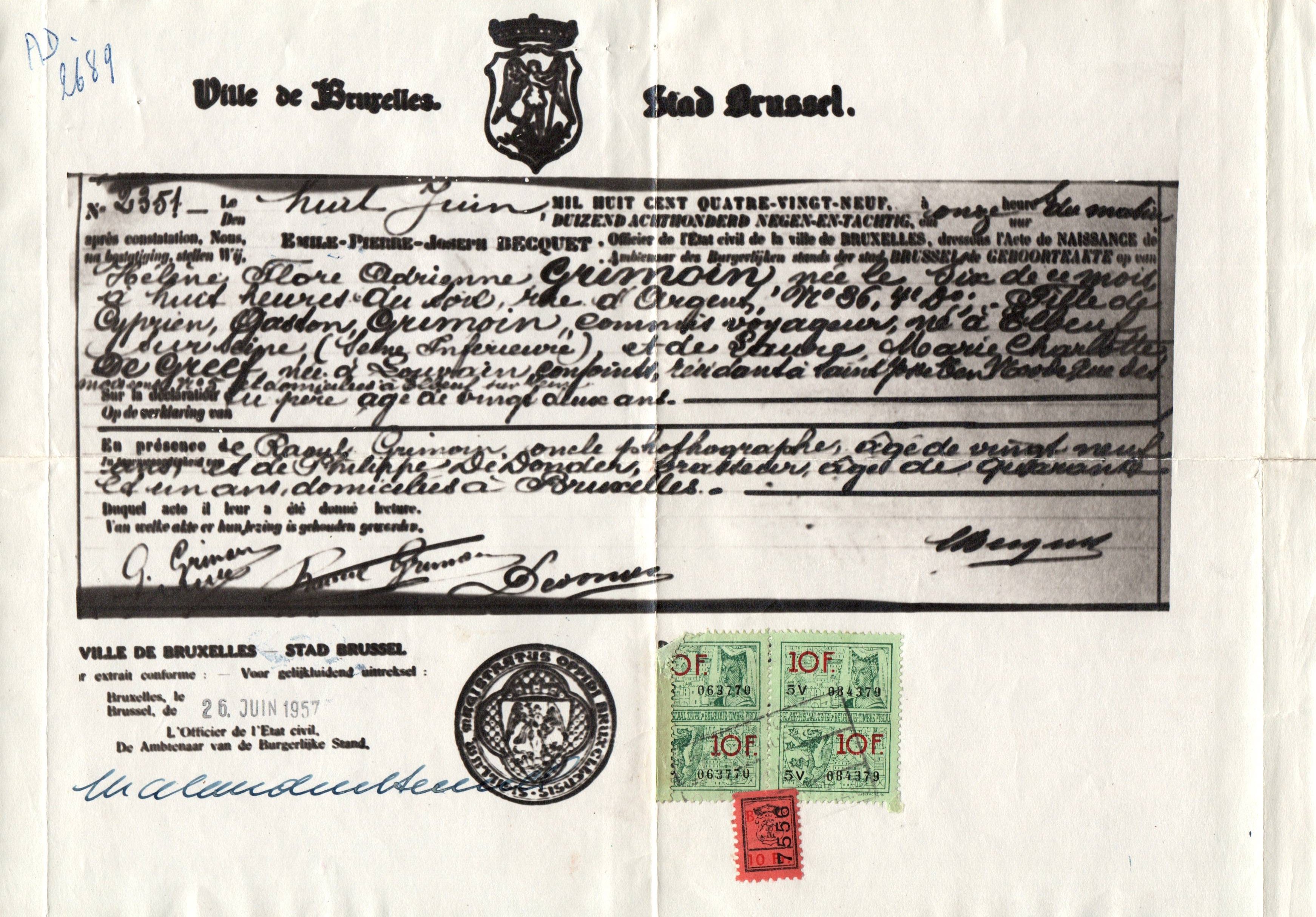 • 1957 : Grimoin Hélène: Extrait d'acte de naissance