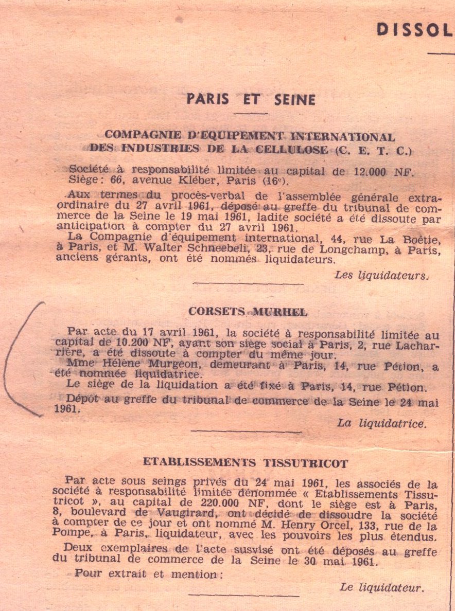 • 1961 : Murgeon Hélène: Dissolution de sa boutique