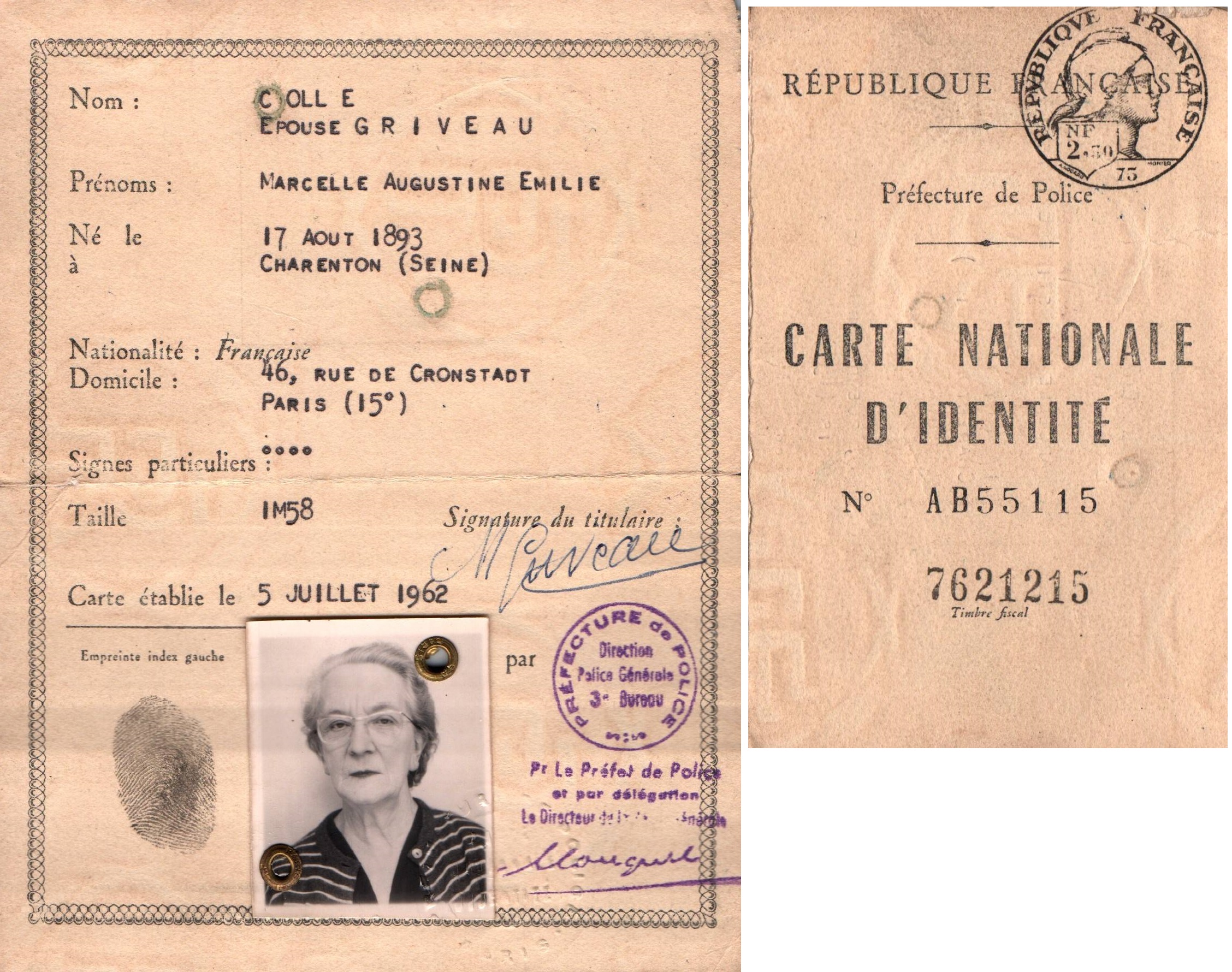 • 1962 : Colle Marcelle: Carte nationale d'identité