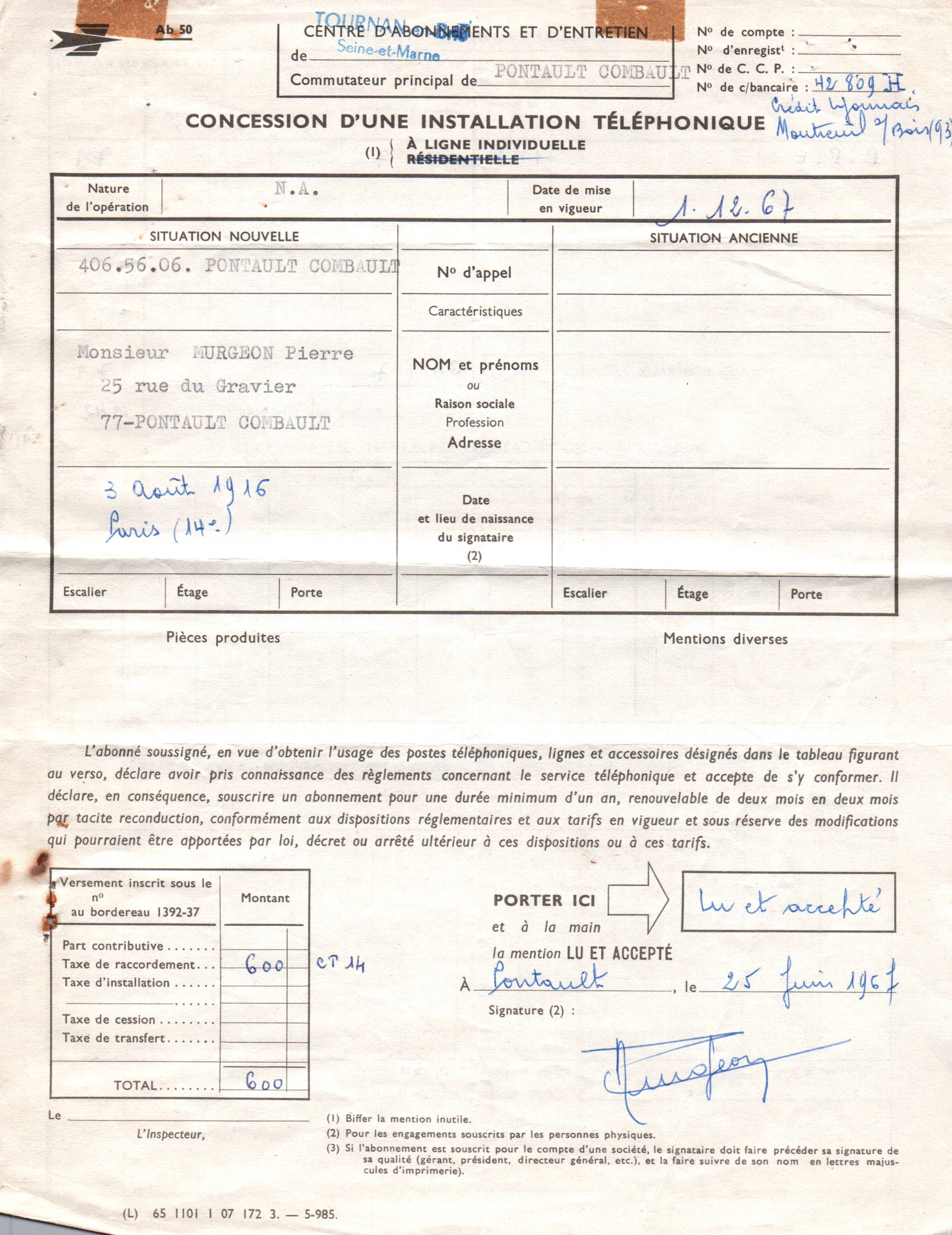 • 1967 : Murgeon Pierre et Fernande: Concession d'installation téléphonique