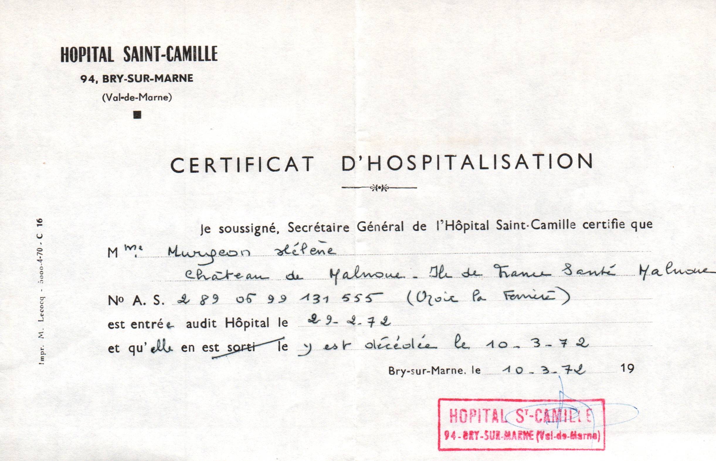 • 1972 : Grimoin Hélène: Certificat d'hospitalisation