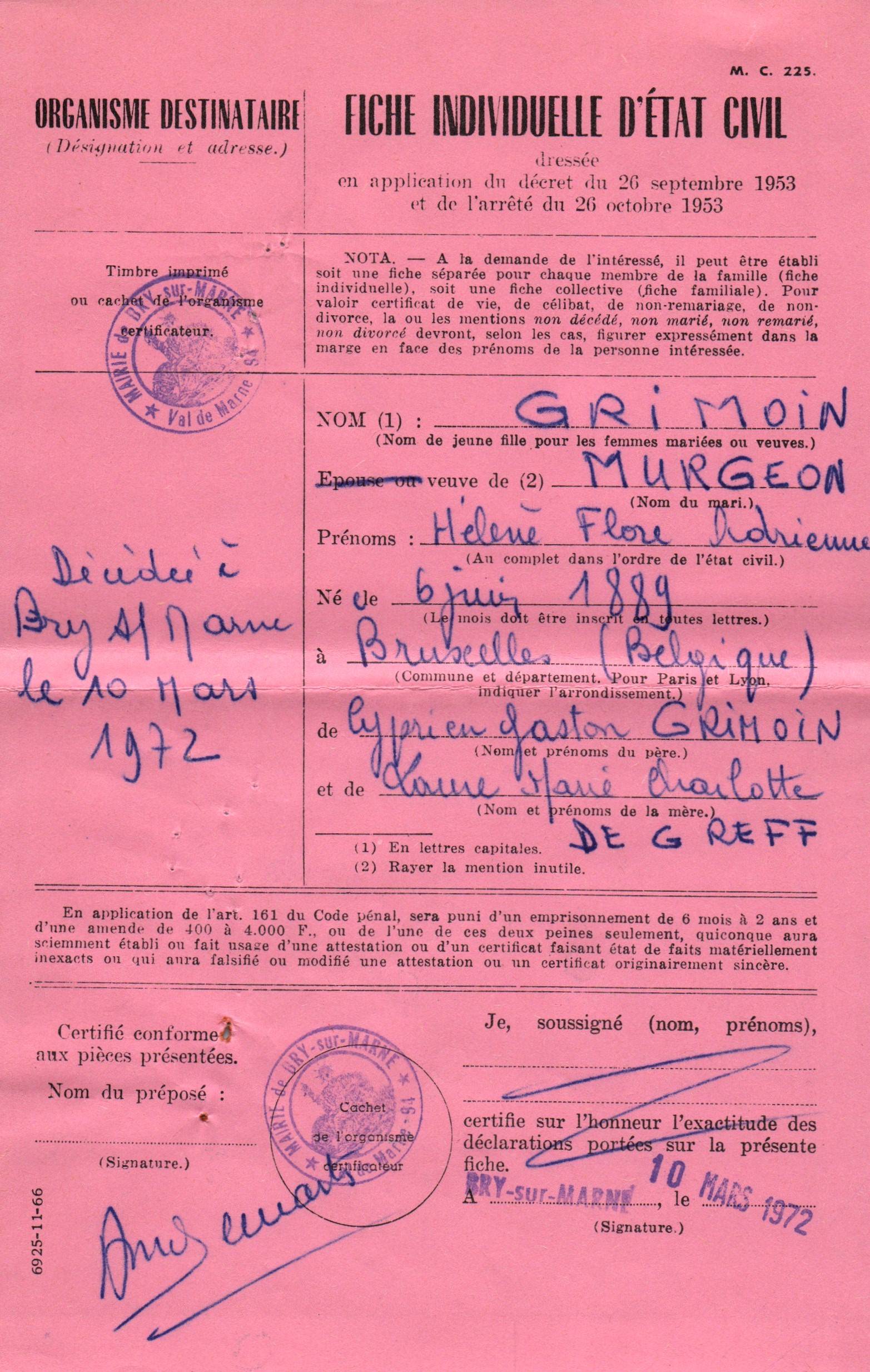 • 1972 : Grimoin Hélène: Fiche d'état civil