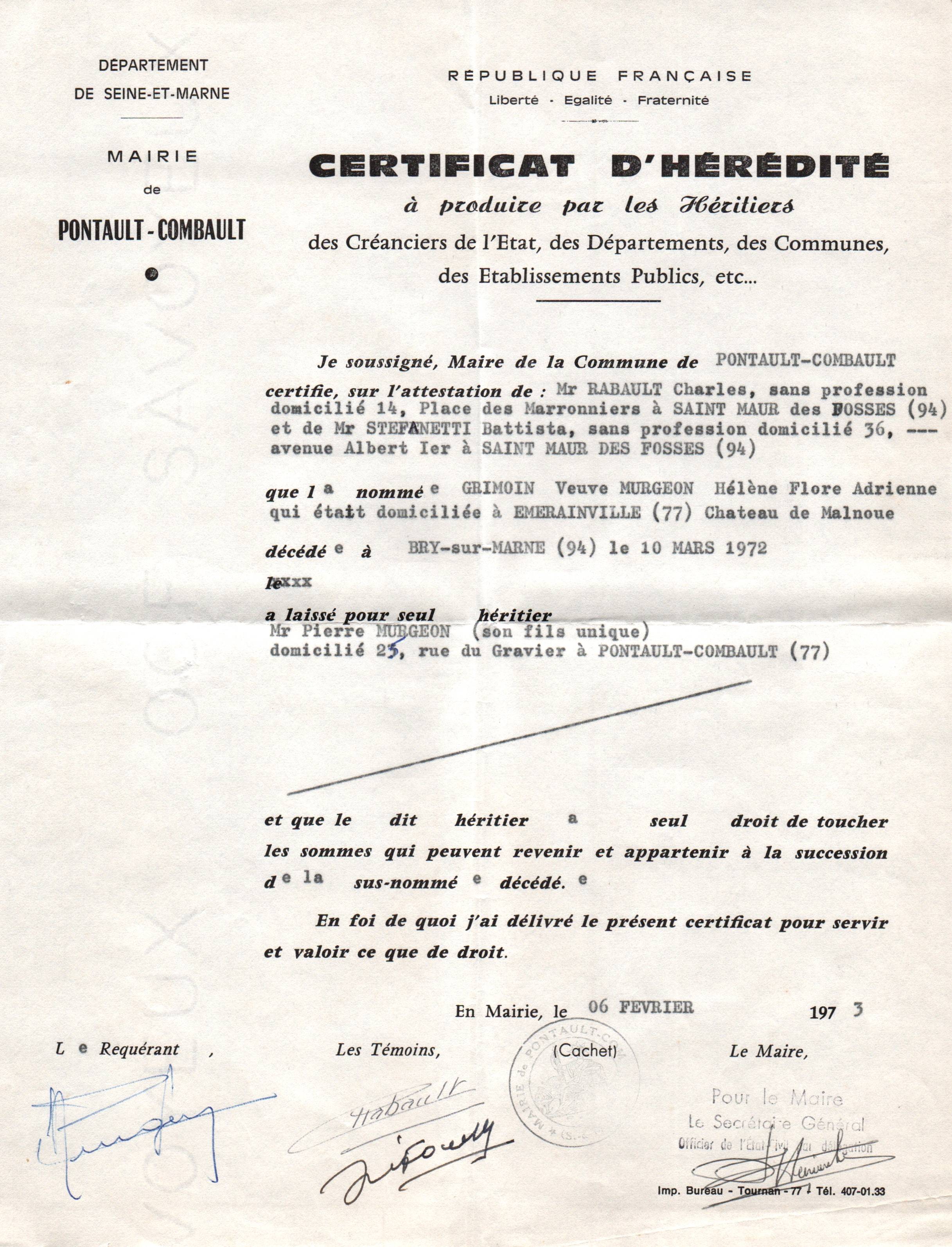 • 1973 : Murgeon Pierre: Certificat d'hérédité