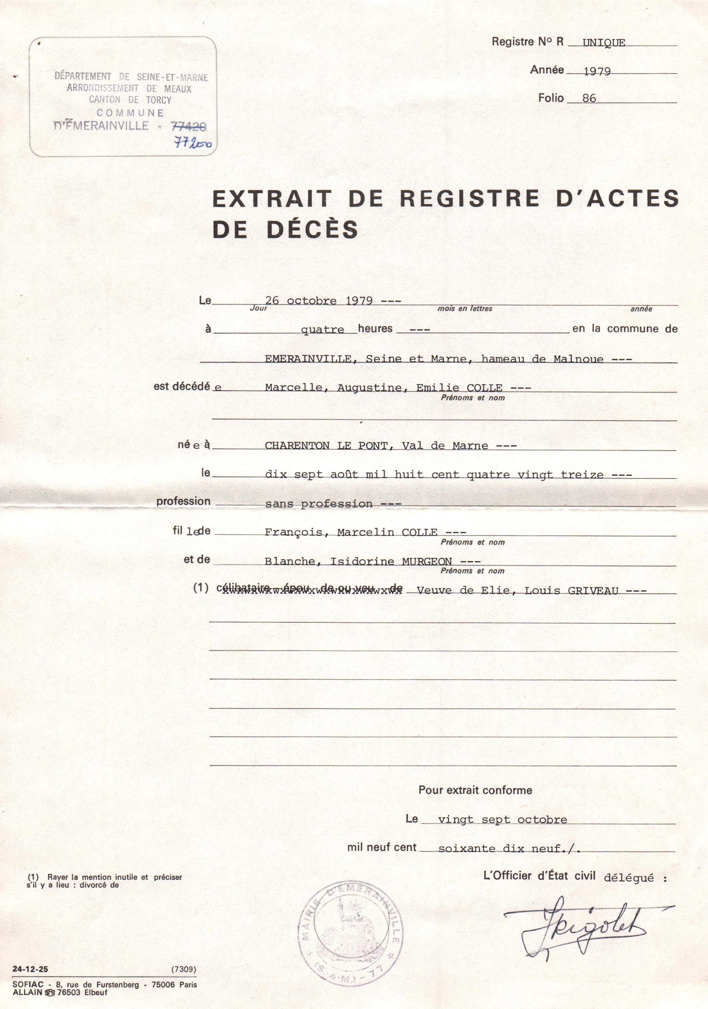 • 1979 : Colle Marcelle: Acte de décès