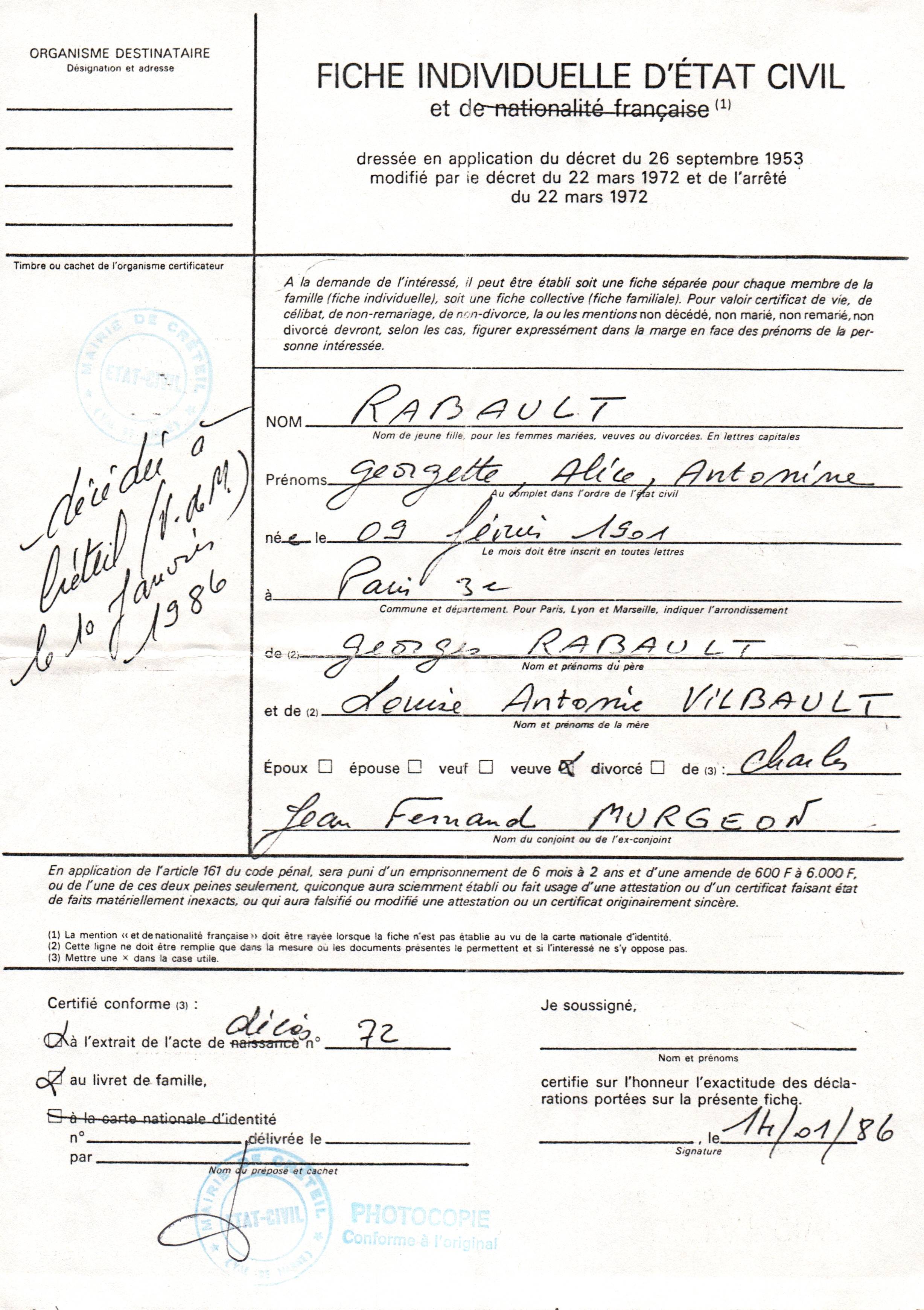 • 1986 : Murgeon Georgette: Fiche d'état civil (annotation du décès)