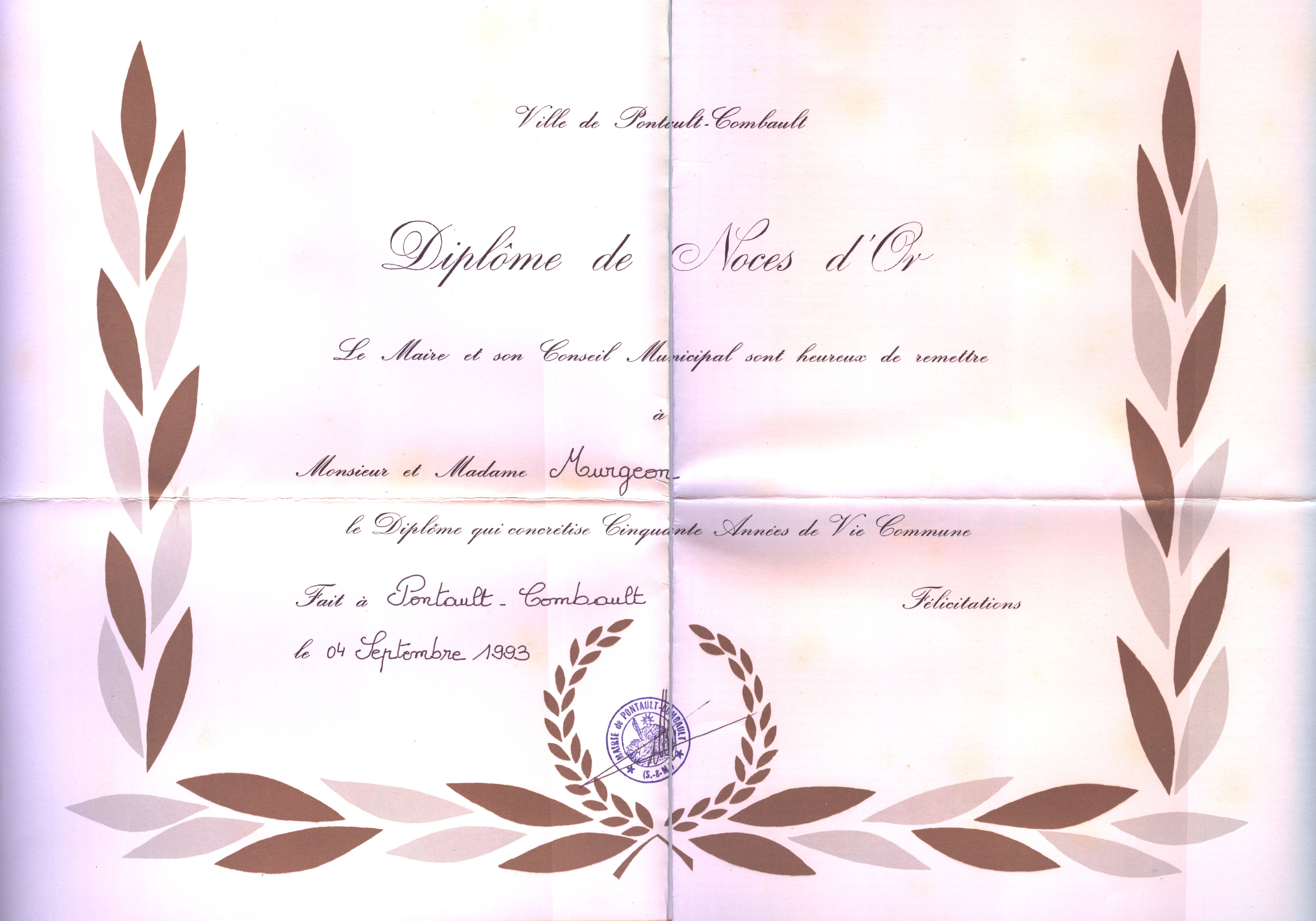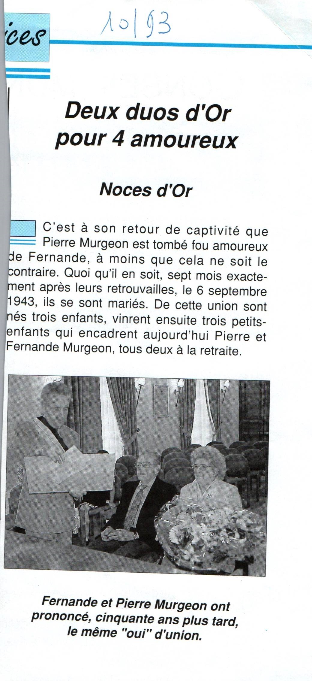 • 1993 : Murgeon Fernande: Diplome de noces d'or
