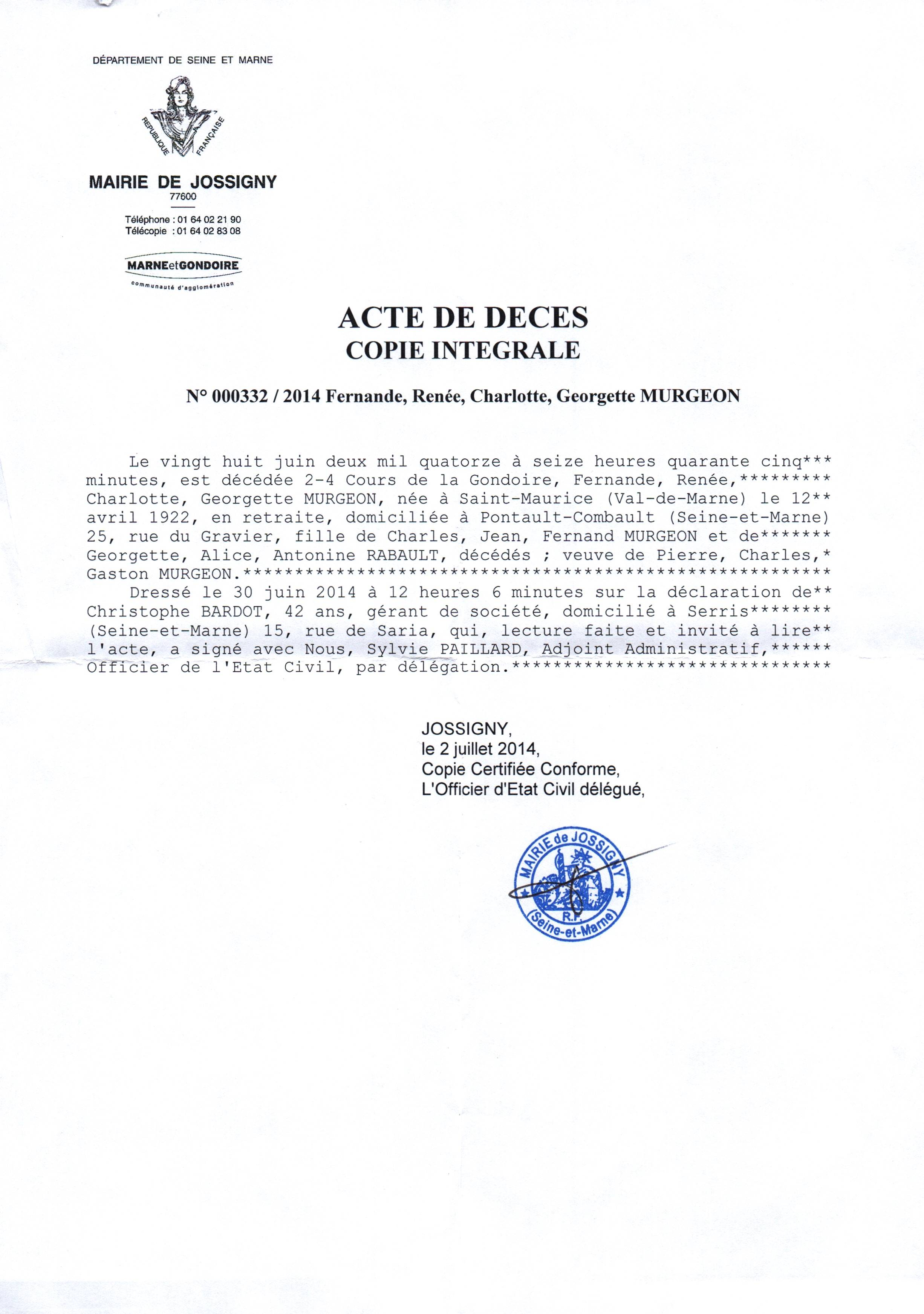 • 2014 : Murgeon Fernande: Acte de décès