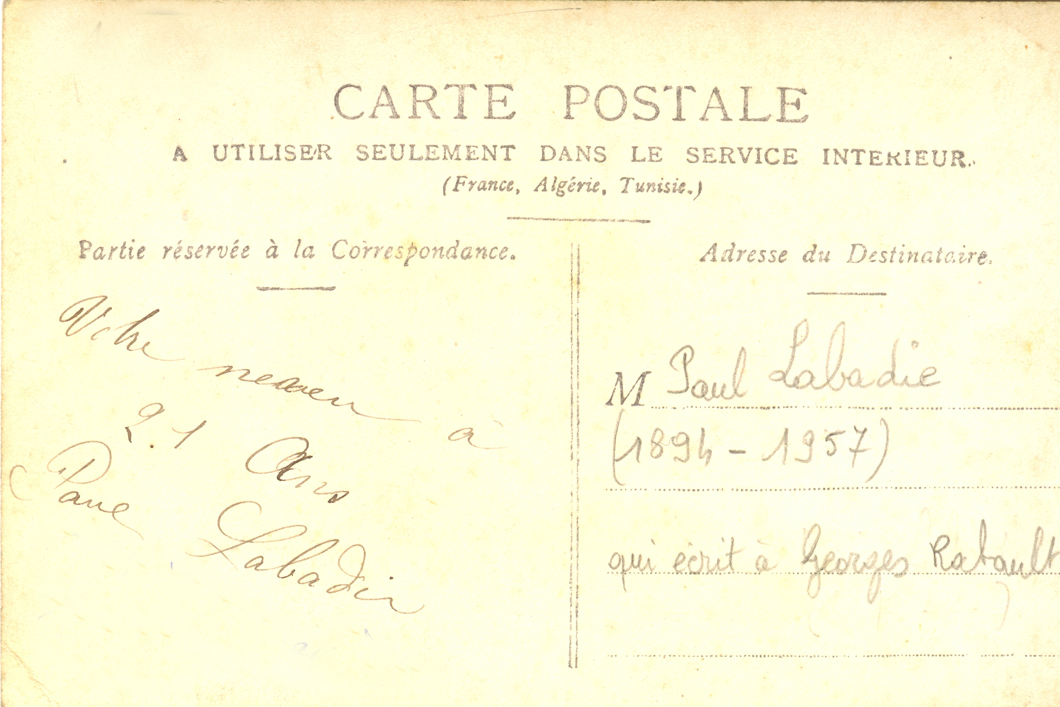 9 : dos de la carte postale photo 8 précédente (Paul Labadie (1894-1957) écrit à son oncle Georges Rabault (1874-1934))
