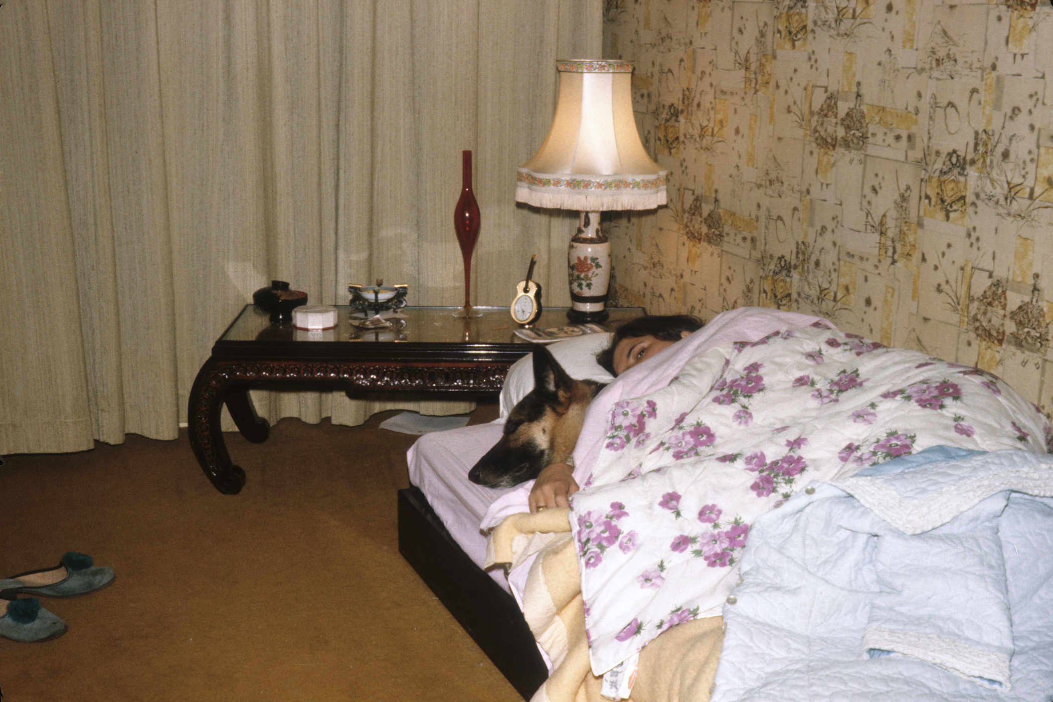 29: Françoise Murgeon, dans sa chambre chinoise, 25 rue du Gravier à Pontault 77, avec son chien "pin up"